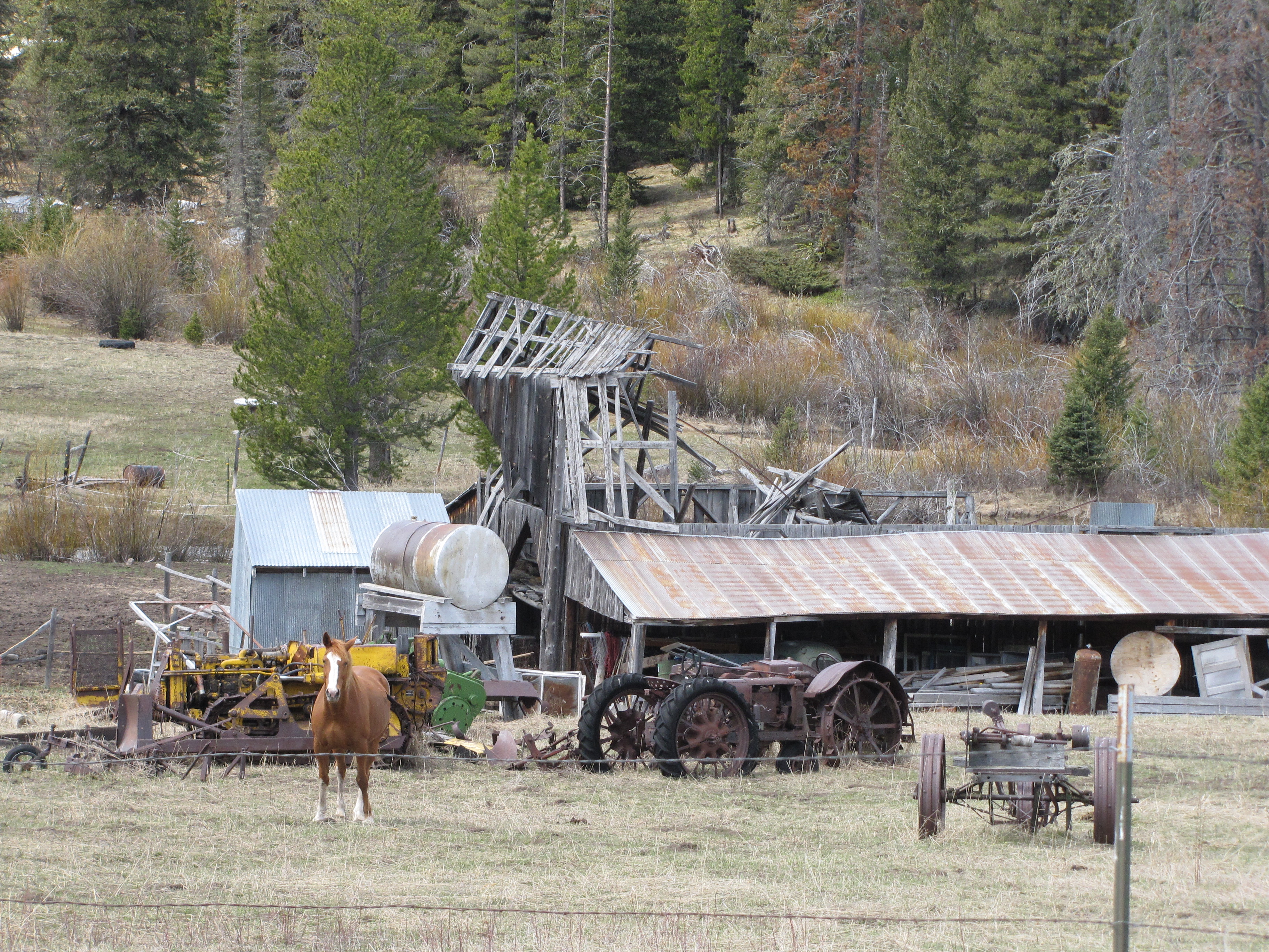 Horse in the field of a pretty decrepit-looking farm. But he was well fed, so I felt good about that. Kinda cool seeing the old equipment.