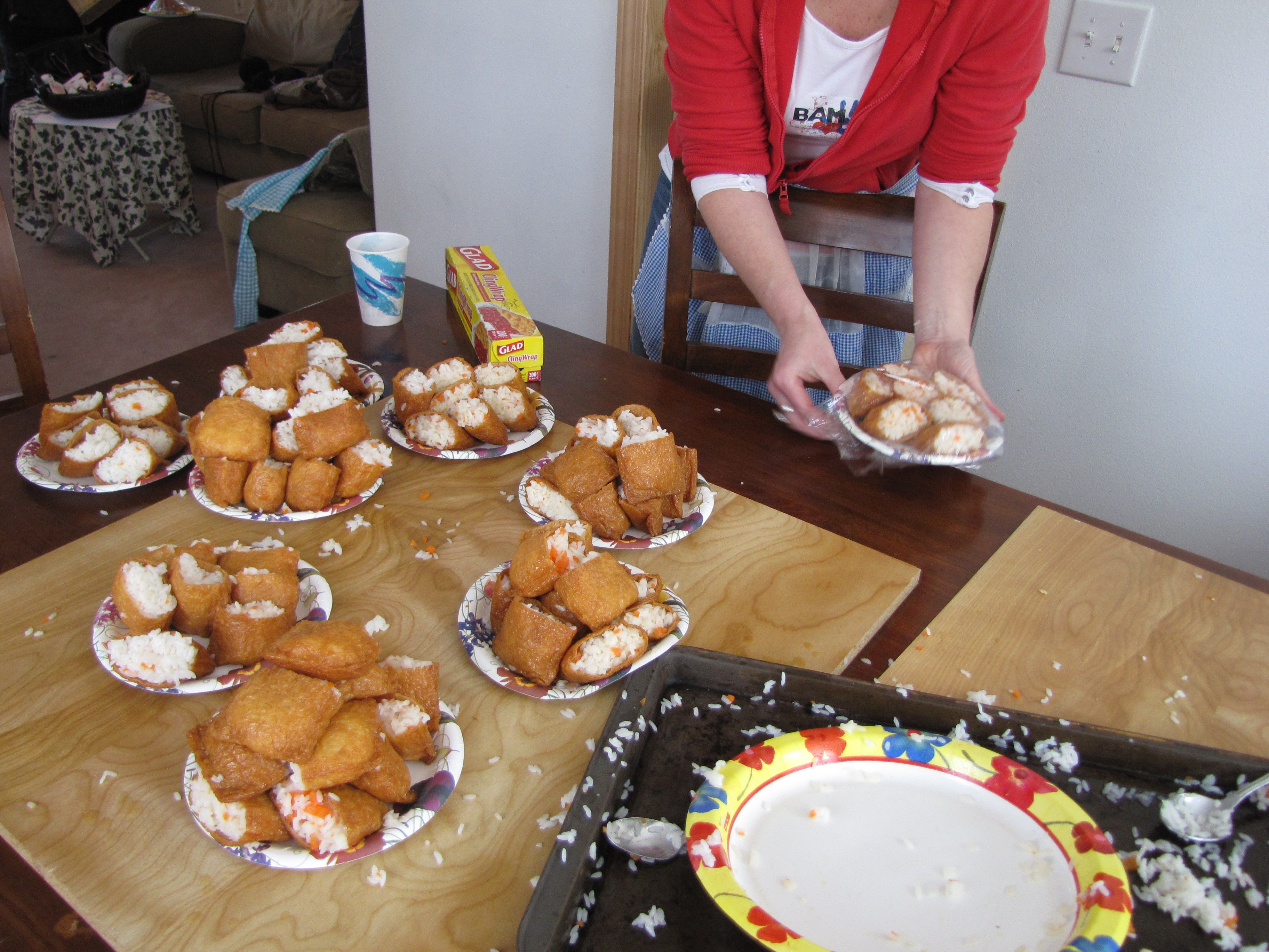 We wen slowly add da warmed sushi seasoning mixture, anden we moved everything out to A’s dining room table.  Inari on a couple of plates, rice in the middle, and plates for everyone.  Let the filling begin!