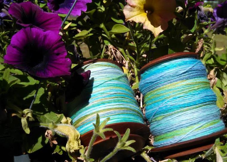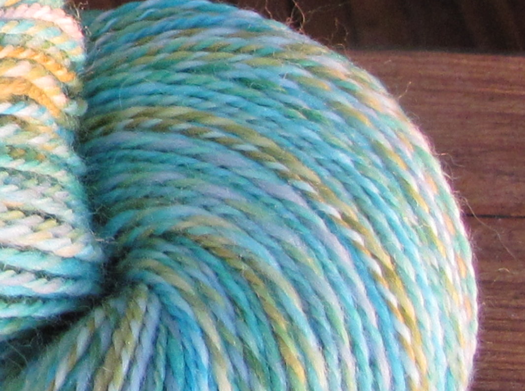 My goal this year was to spin and ply this fiber, “Splash”, by FatCatKnits, on my vintage Joe Jorgensen wheel, one of the ones I rescued from a dirty old barn last year.