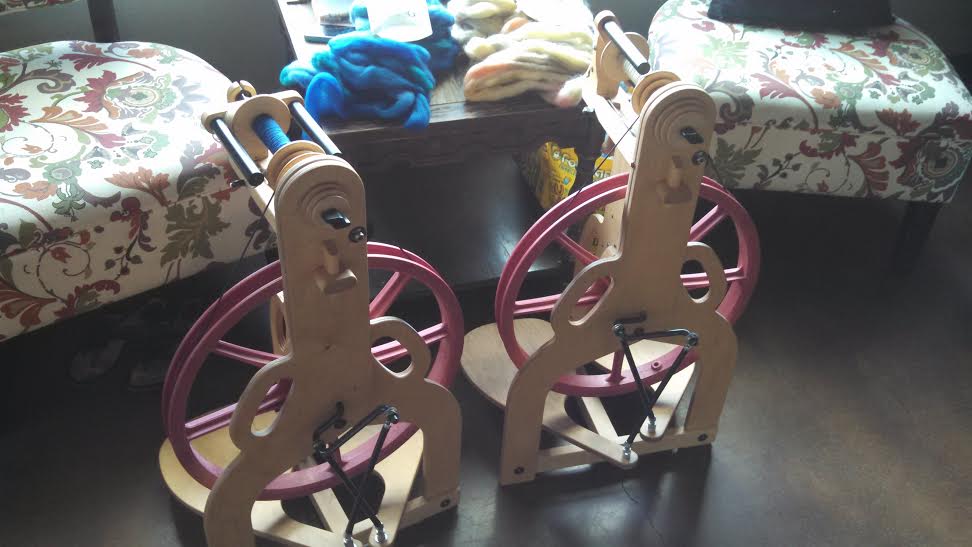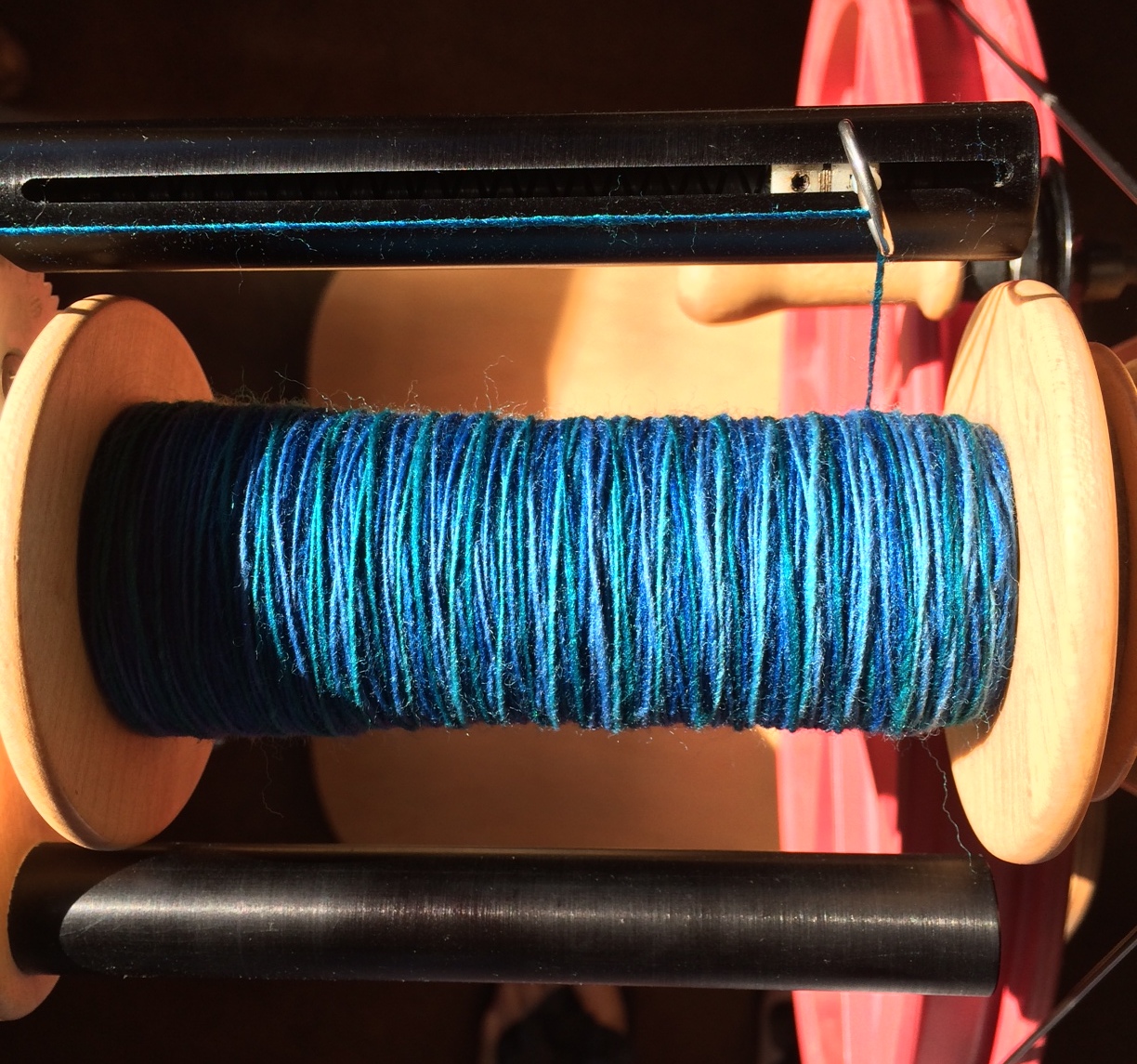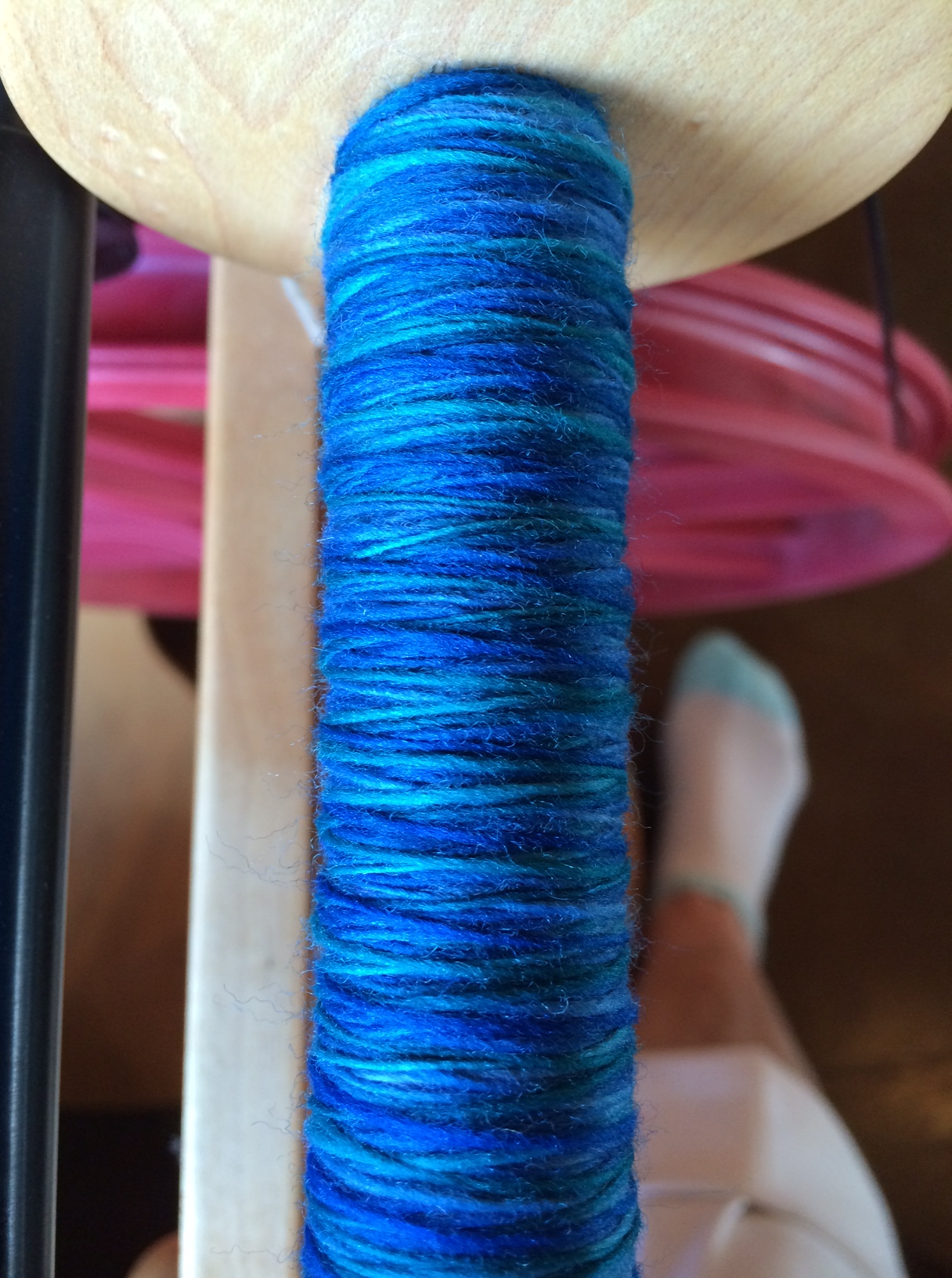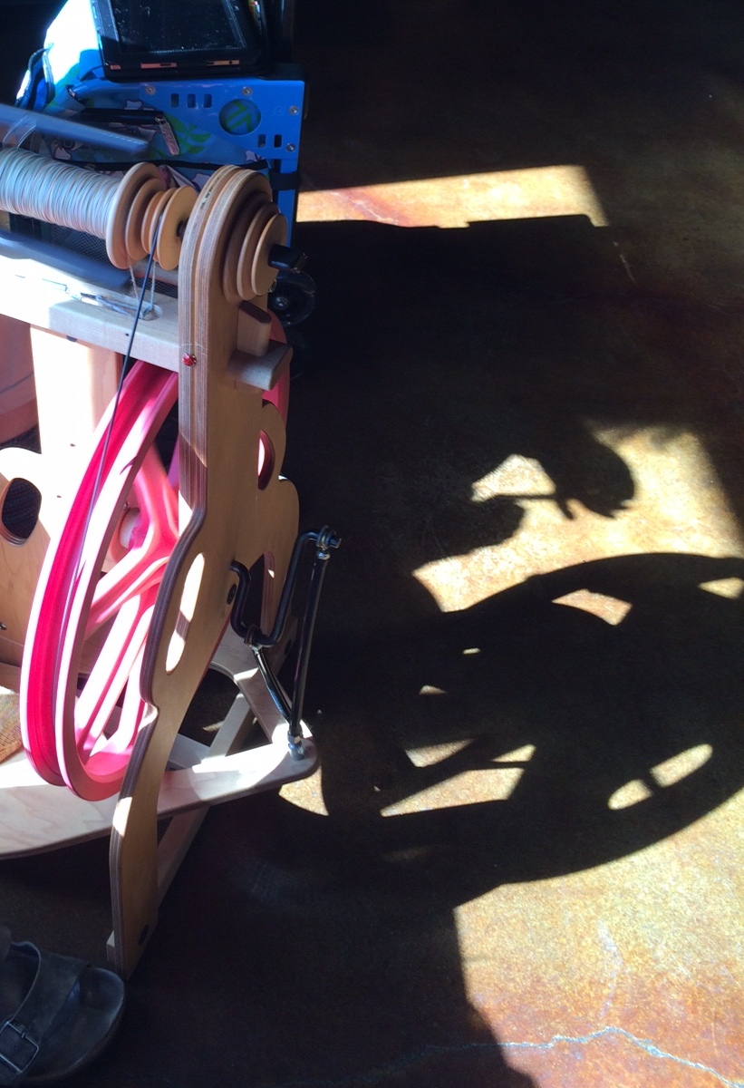 I was spinning my second bobbin of “Cedar Waxing” in Polwarth and Silk, and it’s absolutely glorious. Ha ha! Matching wheels, matching Indie dyer, and two birds! Just realized that.