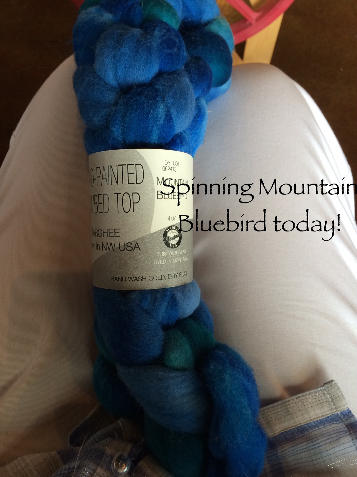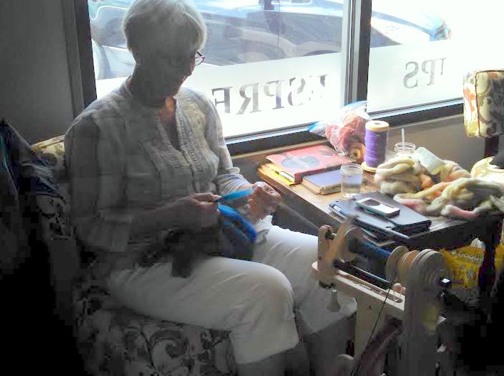 Suzette was spinning “Mountain Bluebird” in Targhee, one of my very favorite colorways. I might just have enabled her a teeny bit by spinning up that colorway last year. (I spun it for a special family member and loved it so much that I bought even more and Suzette bought some too!)