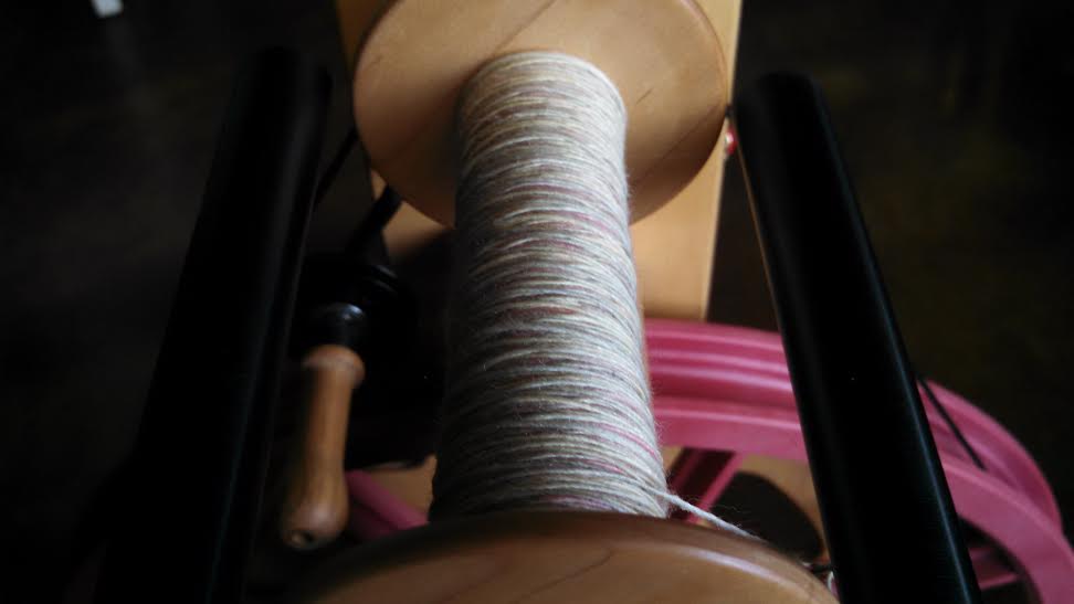 “Cedar Waxwing” is a lovely colorway to spin! The silk in it gives it a lovely, lovely, sheen.