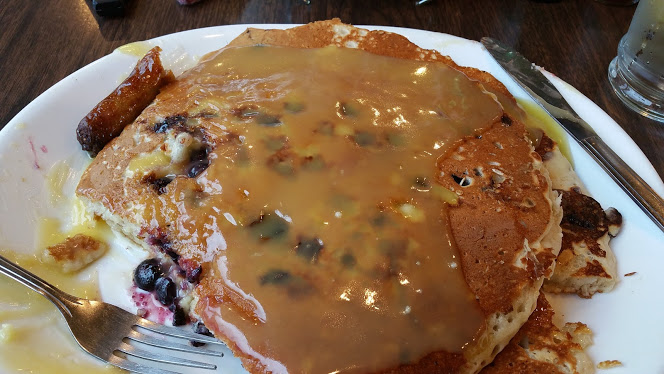Auē!  Last time I forgot to show photos of our grinds!  Ack! So here’s the photo of my amazing lemon/blueberry pancakes with lemon sauce.  Ho da ʻono!!