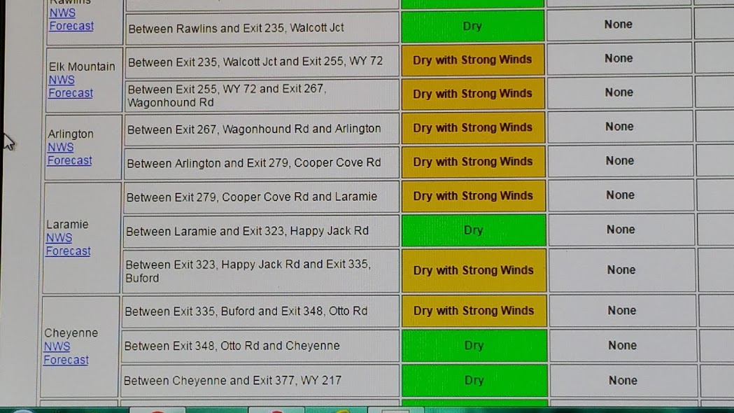 I’ll tell you this much, though. Wyoming WYDOT webcams are fabulous! They have cameras facing east, facing west, and what the road surface looks like as well. And each photo will have a caption like “View facing east”, “View Facing West”, so it’s extremely easy to know exactly what you’re looking at. I didn’t see the big yellow truck, but was extremely impressed at how thorough the webcam websites were.