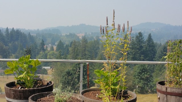 This morning I couldn’t stand it anymore. I hobbled out to our lānai to check on the garden (in tubs), to feel the sun on my face, and to look at the smoke across the valley. Yikes.