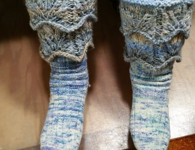 I was gifted these fabulous boot toppers from Michelle over at Boulderneigh. I just love them! I was wearing capris one day, and above my socks my legs were freezing, so I pulled the toppers down to keep my legs warm; look how great they match my handknit socks!! Mahalo nui, Michelle… I love them!
