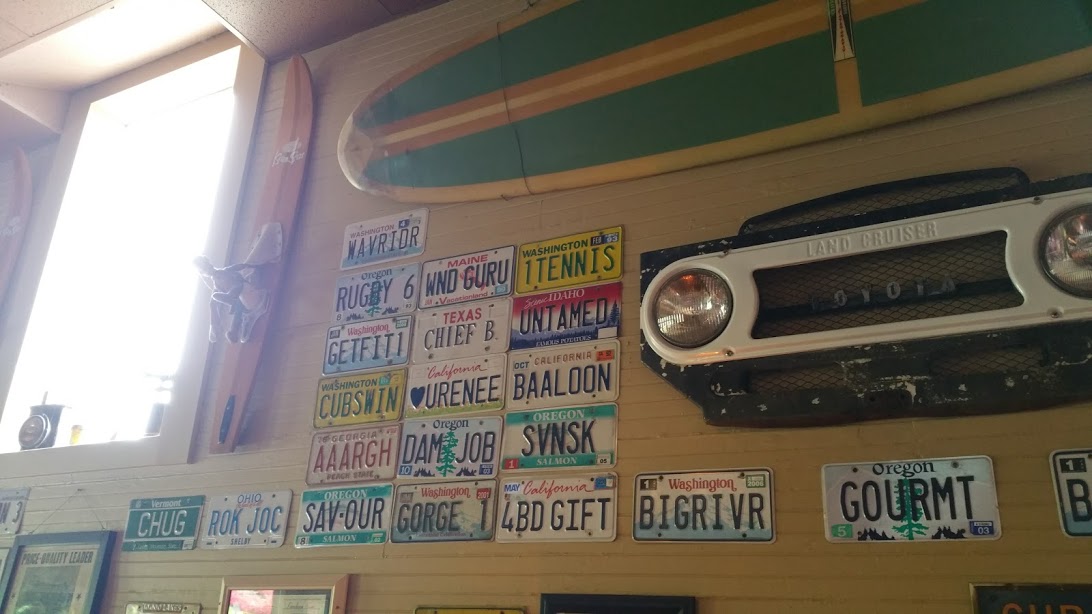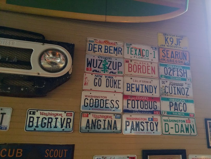 Last year my daughters took me to Big River Grill in Stevenson, Washington, for Mother’s Day. The food was ʻono to da max, and there were these license plates from all over the world on the walls. Checkum out:
