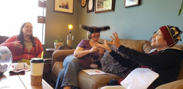 This is how we do show and tell at Knit Group at the coffee shop: Toss the finished object to be admired across to the other people. In this case, it was a sock.