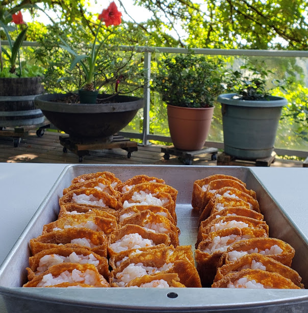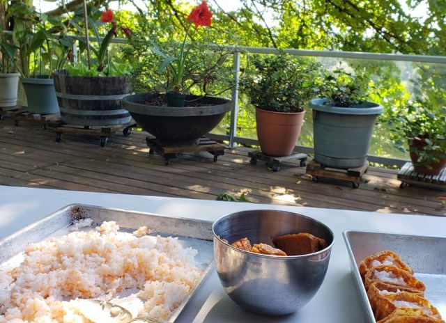 And for a potluck, I wen make cone sushi outsai on da lānai. Ho da ʻono!! Nā manu singing all around me, da makani blowing in da trees, on a beautiful day.
