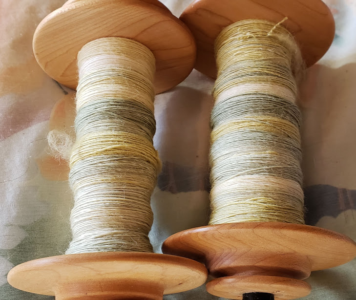 While searching through my spinning basket, I found these two bobbins, which I’d totally forgotten about. They need plying, too. I’ll chain ply these ones to keep the colors separated.