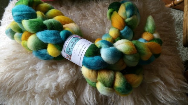 I’m in the middle of spinning this luscious stuff, “Elfin Magic”, by FatCatKnits.