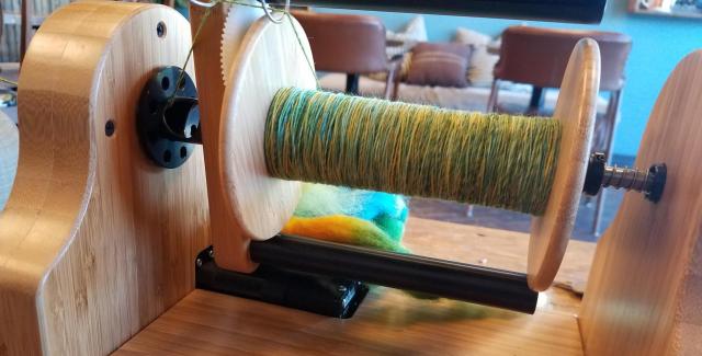 I want to ply the singles on these two bobbins together. I’m in the middle of knitting a shawl with this colorway, and ran out of yarn, so I had to spin more. This is “Beargrass”, from Raven Ridge Fiber Arts, and it’s one of my favorite colorways.