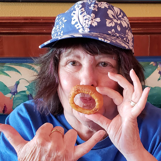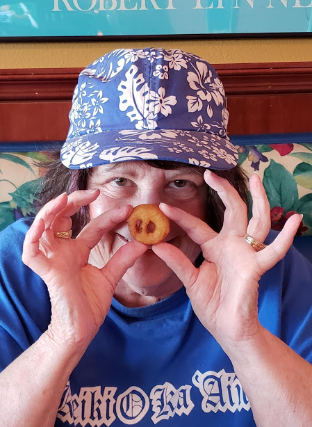 Then I noticed that one of the onion rings; oh my gosh…it reminded me of one ihu pua’a!  And I wen tell Nolemana, “Eh, I gotta do dis one, too!” He thought I was pupule. Considering I don’t like my photo taken, yeah? I musta been stoned from the doctor appointment, though I swear they gave me no meds. Maybe it was the adrenaline rushing through my veins. Maybe it was all the good kau kau and I felt like a pig. I hope I don’t regret this. Just remember…all my photos here stay copyrighted! No kakaroach um.