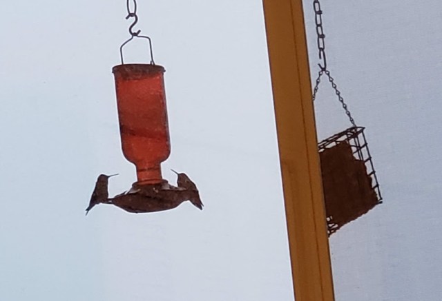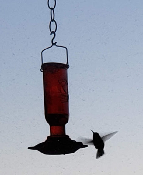 Nolemana put up a hummingbird feeder right outside the bedroom window for me.