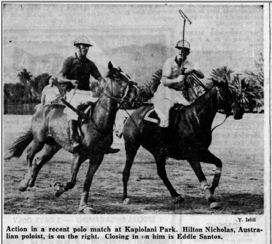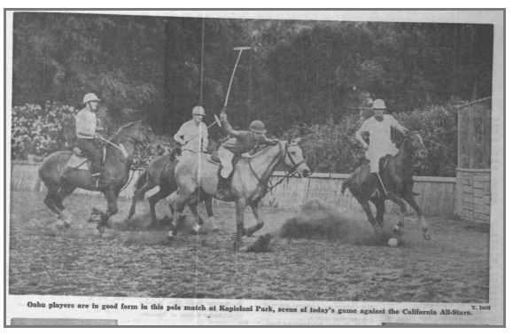 This story is about polo ponies. They were boarded at the same place as Kapiʻolani, and during the summers, there were polo matches on Sunday afternoons at Kapiʻolani Park, which was across from the stables. On those days, I got to be one of the girls who hot-walked the ponies between chukkars. We all loved doing that. The ponies were so hot from all the running,  and had to be cooled down, which we did by walking them slowly till they cooled off and were breathing normally. The polo players were happy to leave that job up to us while they continued in the matches. Sometimes we’d walk alongside the hot ponies, and sometimes we’d ride our own horses and walk the ponies beside us, in the shadow of Diamond Head, with the trade winds softly blowing over us, while the sound of shouts, the crack of mallets against the ball, and thundering hooves, echoed in the background.
