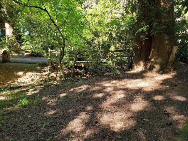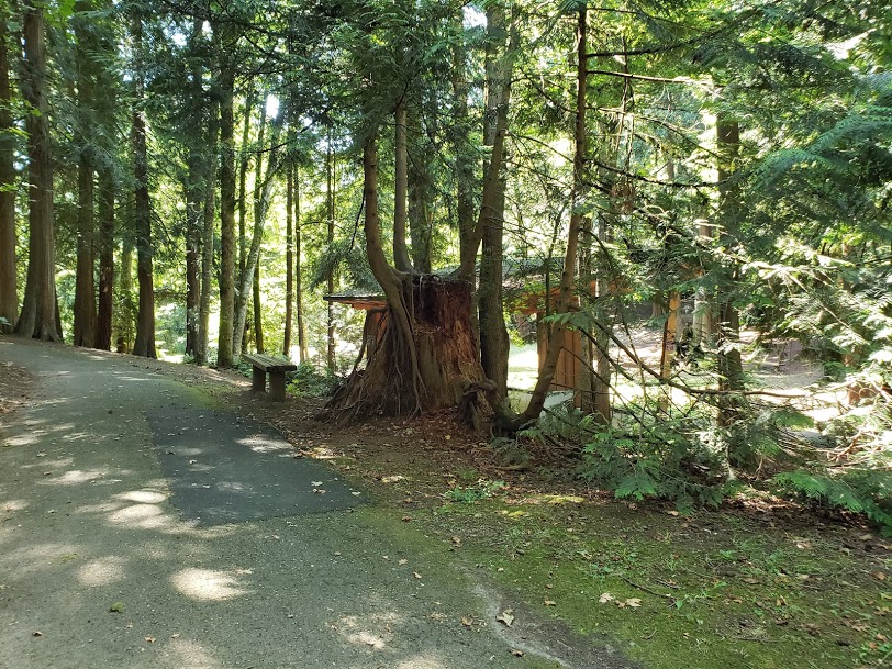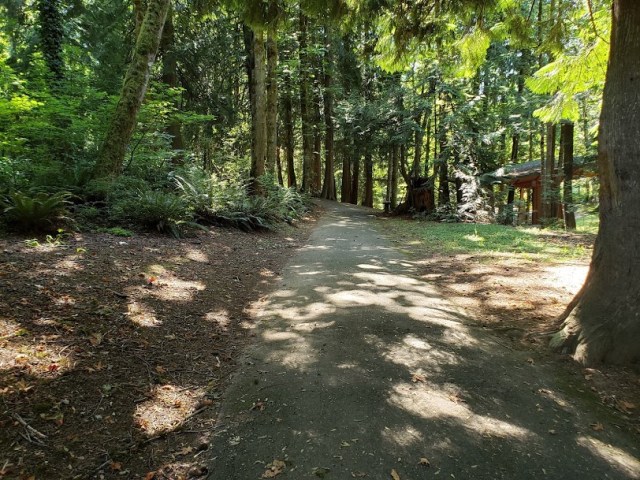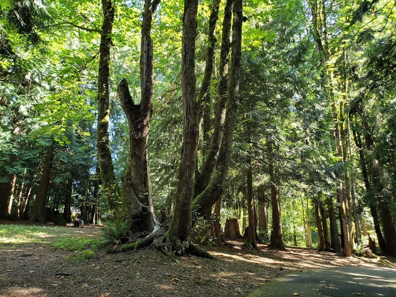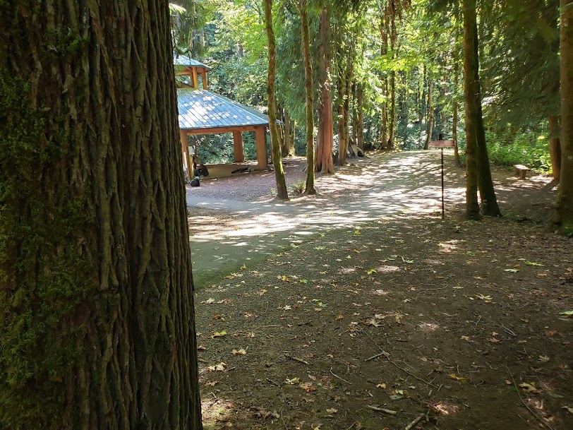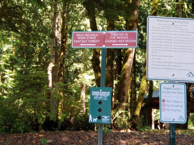 Last Sunday we decided on a new place to holoholo (walkies). We’d already picked up a book curbside at Sandy Library, to I suggested we go to Meinig Park, a beautiful, wooded, park nearby. We used to go there every year for the Sandy Mountain Festival, and had a good time, but we haven’t gone for several years now. And obviously we didn’t go this year. I thought this’d be a good holoholo for us because the trails are up and down and good exercise. This is the entrance from the parking lot.