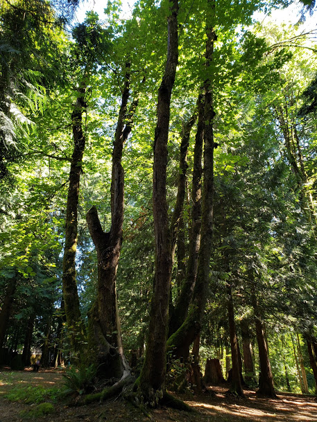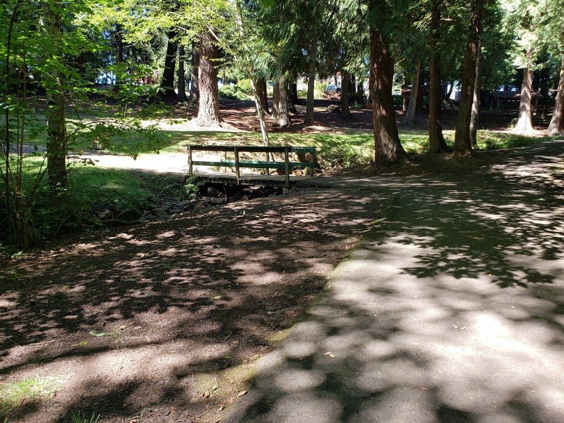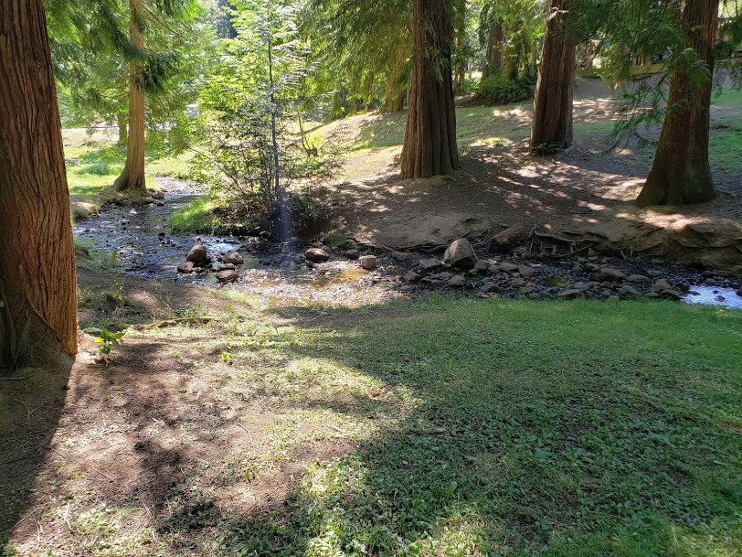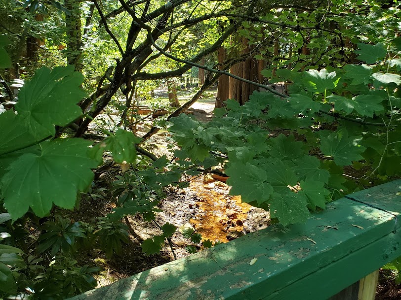 I stood on the bridge. The creek is that kinda brown area in the middle of the photo, but that’s the rocks, not the water. And you can see why they don’t call them Oregon Big Leaf Maples for nothing!