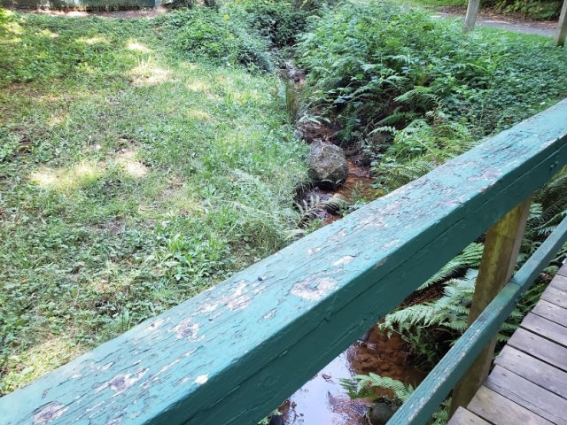 Dappled sunlight made interesting patterns on the ground. And up ahead, there was another bridge over the creek.