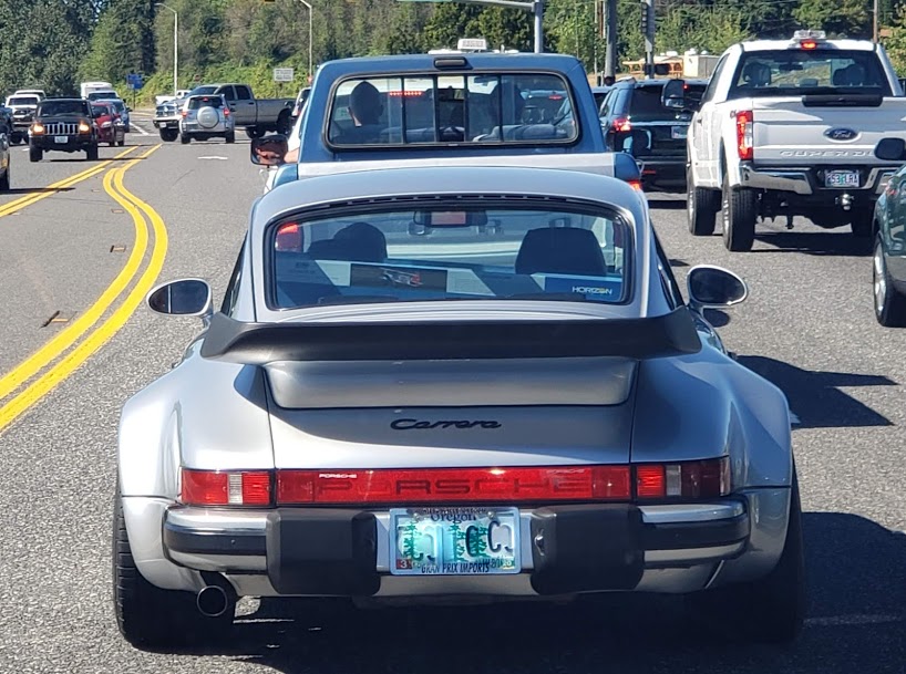 On our way home, traffic was so heavy heading makai on Highway 26, probably because lots of people were coming home from a weekend in Central or Eastern Oregon. This one guy in a Porsche was tailgating me, trying to get past me (I was about to turn left so couldn’t move over). He was obviously impatient even though, or because, traffic was so slow, and maybe he thought his high makamaka car deserved to go faster. Fancy or not, he still got stopped at the light. Poor ting, yah? (I blurred his license plate on purpose.)