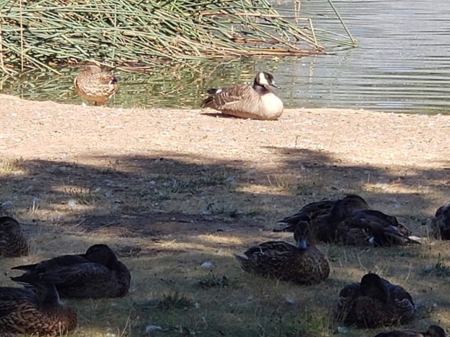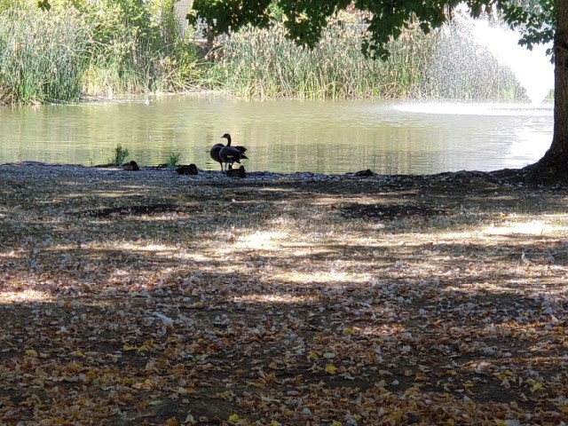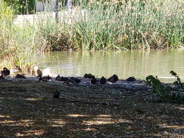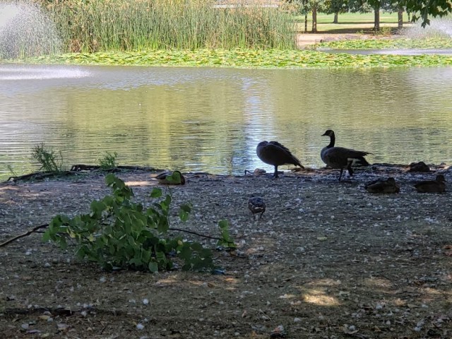 One of the things I love about this park, maybe even the best thing, is that there’s lots of ducks and geese here. Even Canada Geese, my favorites.  When we got here, it was Ducky Nap Time.  One goose was standing guard while the other had its head tucked under its wing for a nap.