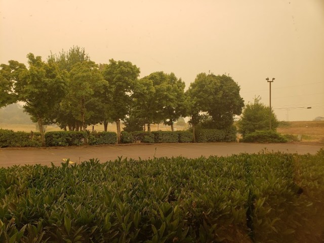 We woke early the next morning and let the kitties out, got them fed (we’d kept them in the bathroom overnight), and though they didn’t eat much, we knew they were okay.  This was our view when we woke up; the smoke was bad even an hour away from the fire we’d just left.  I-5 is just over the berm.