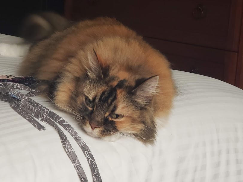 Oh! I didn’t mention that we also had my parakeet, Hulunani, with us. He was a great traveler in between the kitty carriers (they couldn’t see him). So we had to bring his food, and the kitties’ food and litter box. He did a fair amount of chirping the whole time, in the car and in the motel as well.