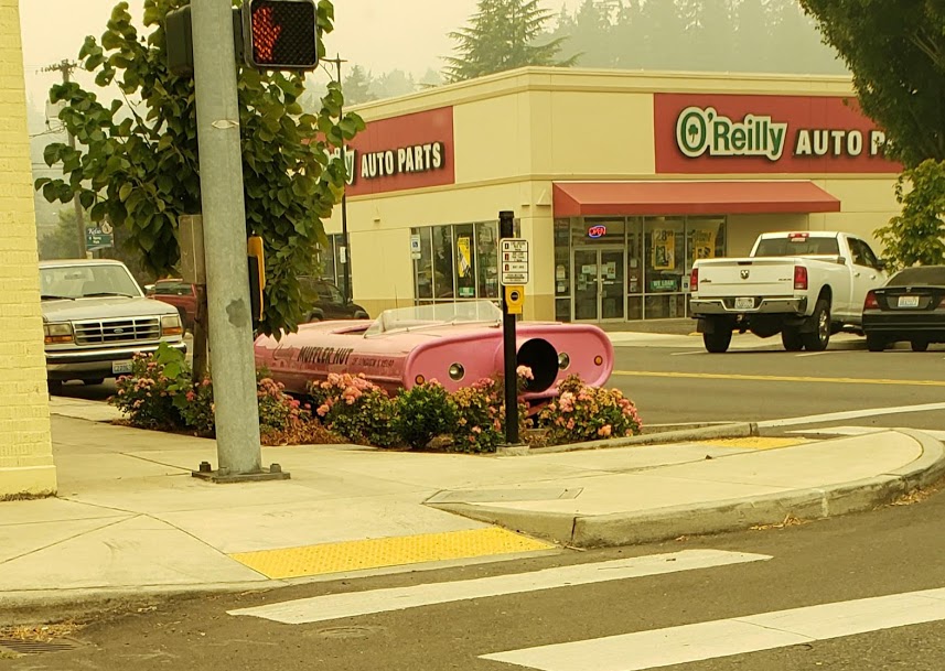 Unfortunately, in the chaos of the previous day, Nolemana had forgotten to pack his insulin syringes, so we needed to make a quick trip to Walmart in the neighboring town of Longview. We left the kitties in the bathroom and put a Do Not Disturb sign on the door to make sure no one entered our room and inadvertently let them out. After doing that, we headed back to Kelso because he really needed to get something to eat. His blood sugar was really getting low. We couldn’t find the breakfast place we were looking for, but we did see this cool way to advertise the muffler shop we passed on the way back.