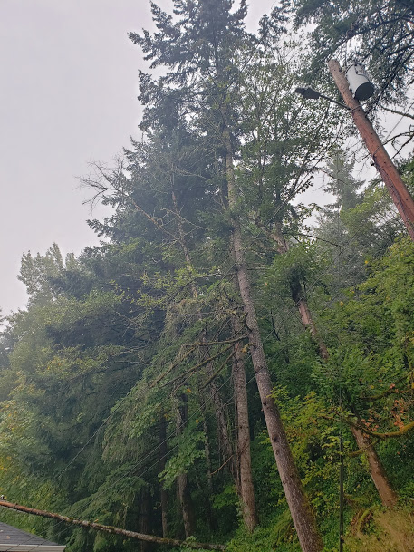 The next morning we realized that our troubles weren’t over yet. We’d noticed an Alder tree that looked pretty precarious, leaning towards our garage, that had been right next to the one that came down. That one wasn’t PGE’s responsibility. See that dead branch at about 10 o’clock? That’s the one.