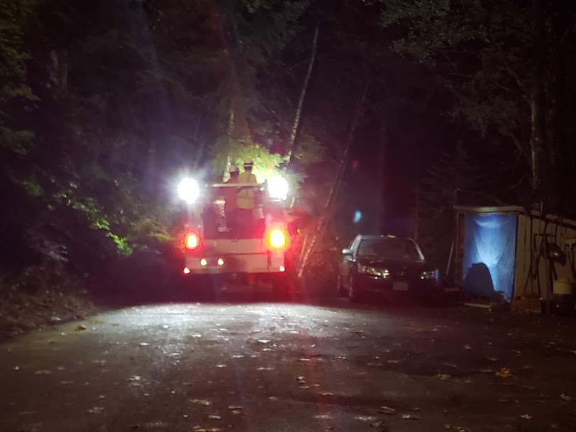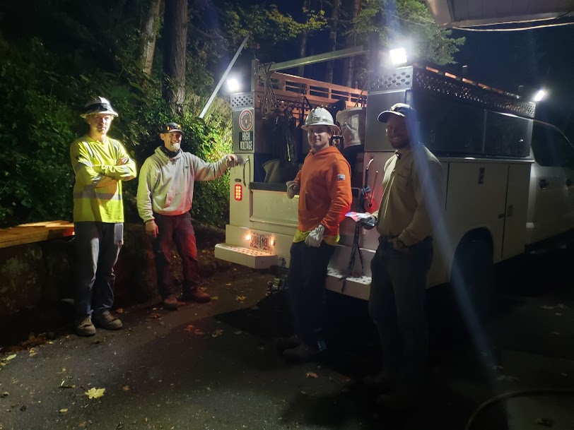 These guys were great! I had some zucchini bread ready to take out to them for treats, and they were very grateful. It had already been a long night for them, and they still weren’t pau. They said I could take their photo…so there we all were at almost 2 a.m. The second guy from the left had been here before cutting tree limbs from lines as a part of PGE maintenance and it was good to see him again.