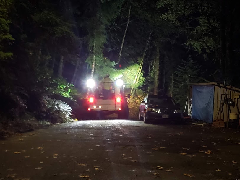 That tree landed on some auxiliary wires from our cable and power boxes. We lost power for several hours but that was due to a downed tree around the hill from us. I called Portland General Electric to let them know about the tree on the wires; obviously it wasn’t an emergency since we had power, but still. They asked me questions to make sure that nothing was sparking or a threat to our wellbeing, and assured us that they’d get a crew out there as soon as possible, but understandably had to restore power to those without it first. They also told me that crews were working around the clock and could come at any time.