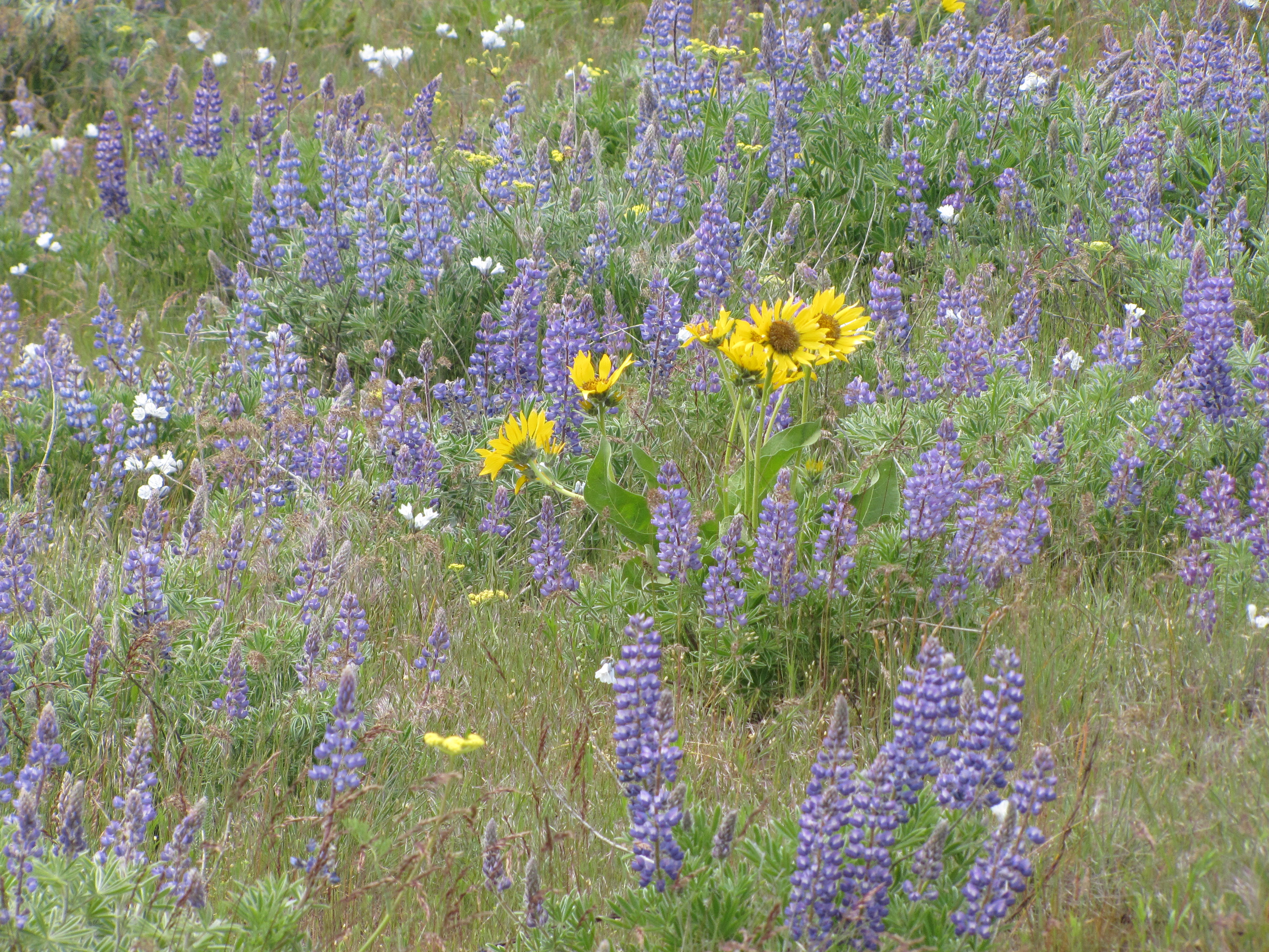 Seeing the Lupine and Arrowhead Balsamroot blooming together always takes my breath away. The white flowers are Wild Phlox.