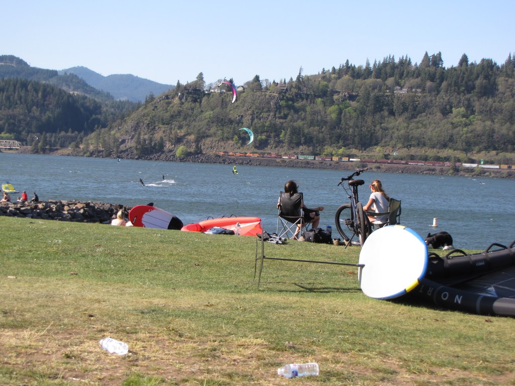 Then we saw a few windsurfers out on the river; there were lots of spectators around, probably family coming for picnics, too. And see da train still?