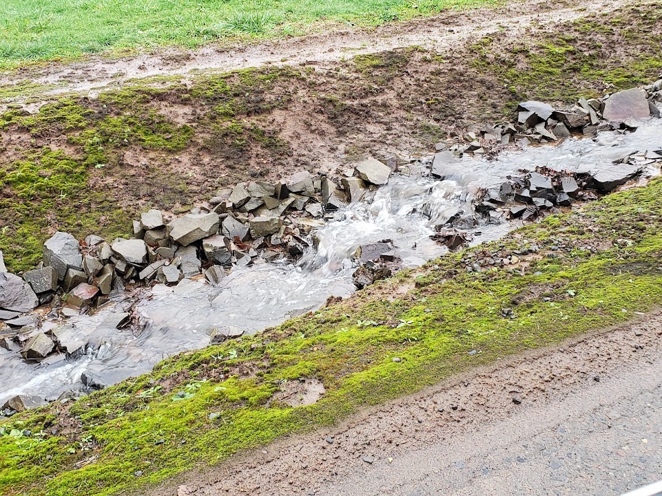 Water from our hill is flowing down next to our road. Small kine waterfall.