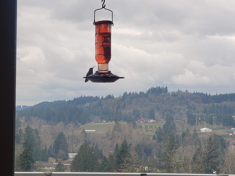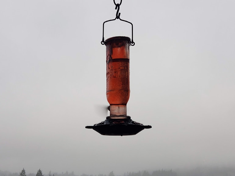 Daily hummingbird. I moved the pineapple feeder to the kitchen window; when it was next to the red feeder it wasn’t getting used at all. But by itself, the hummers like it.Sideways rain and a beautiful sky.