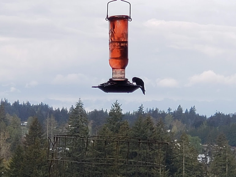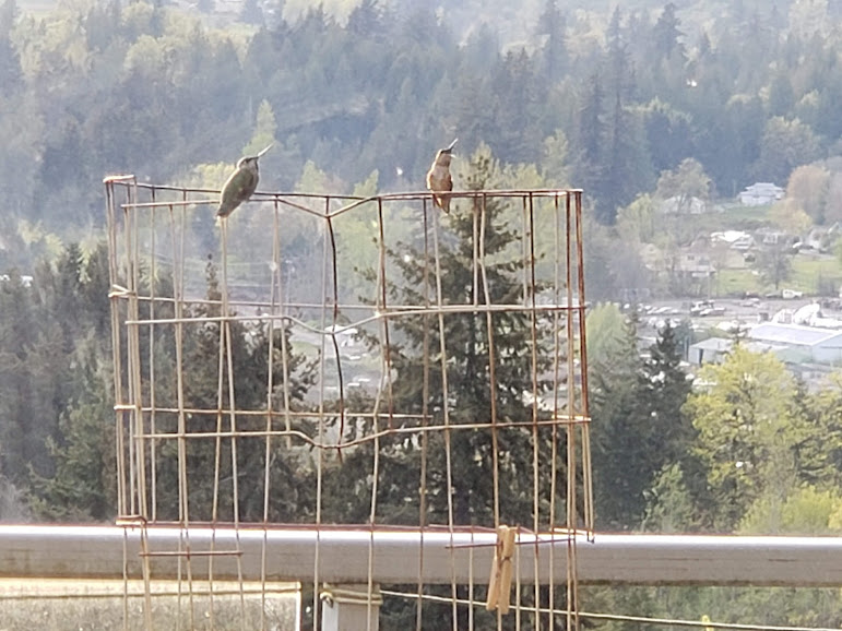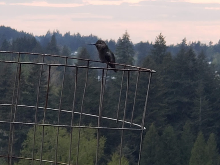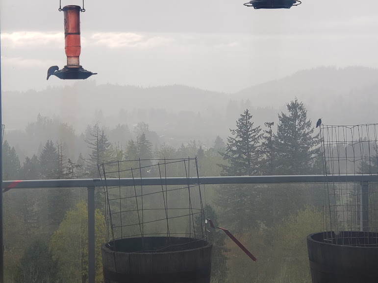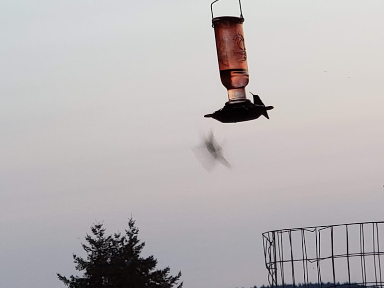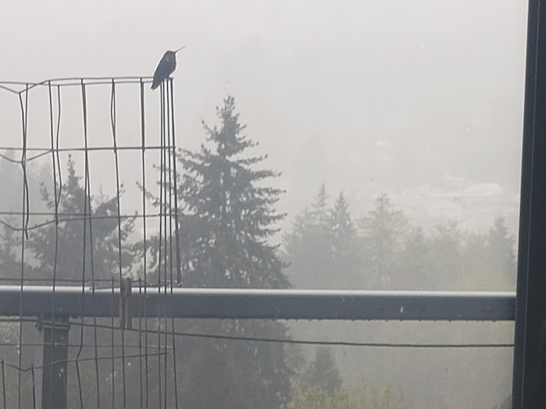 Daily hummingbird chased off the other one; and rain coming in.