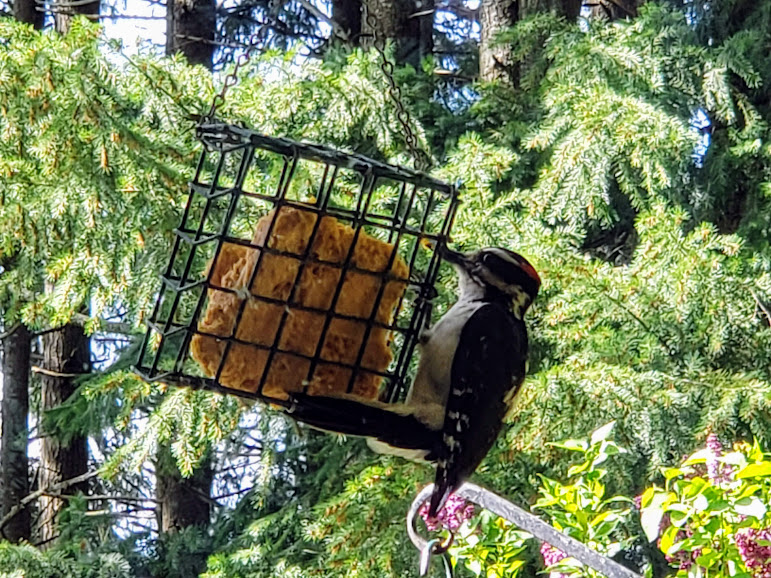 And for your viewing pleasure, a Hairy Woodpecker at the suet feeder. In the background (I wish it were louder), Kaukahi is singing, ʻUlili E”.