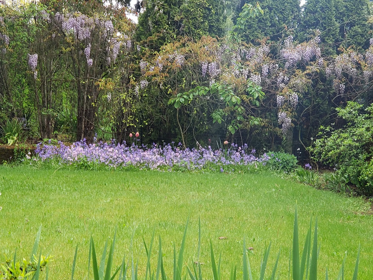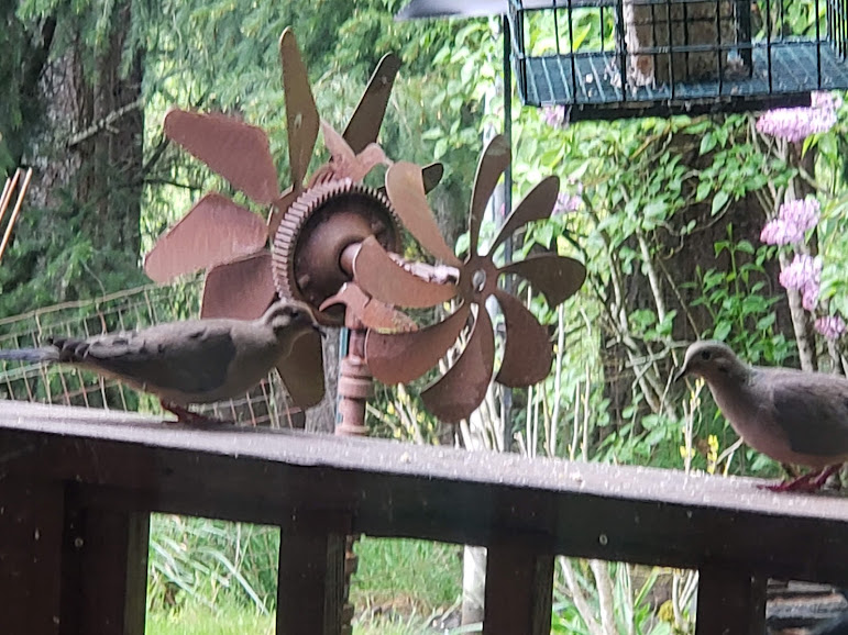 Food deliveries today. This half of what we delivered.This is what my route usually looks like.Beautiful Wisteria and purple flowers at one of my deliveries.Mourning Dove pair on the railing.Daily hummingbird.