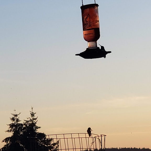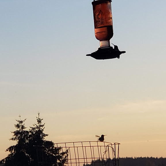 Daily hummingbird cleaning its beak while one stays at the feeder.