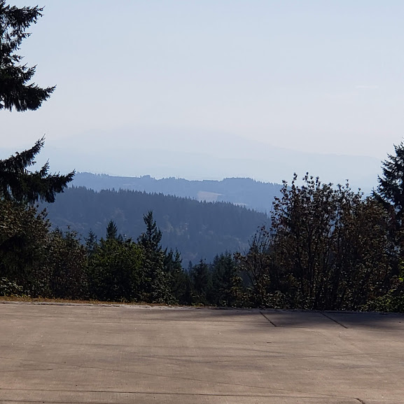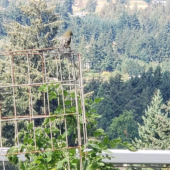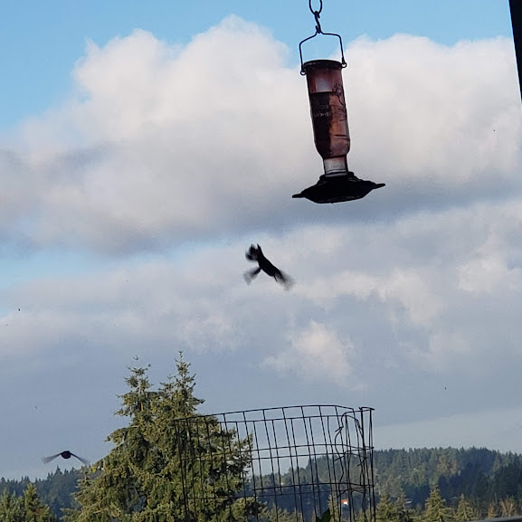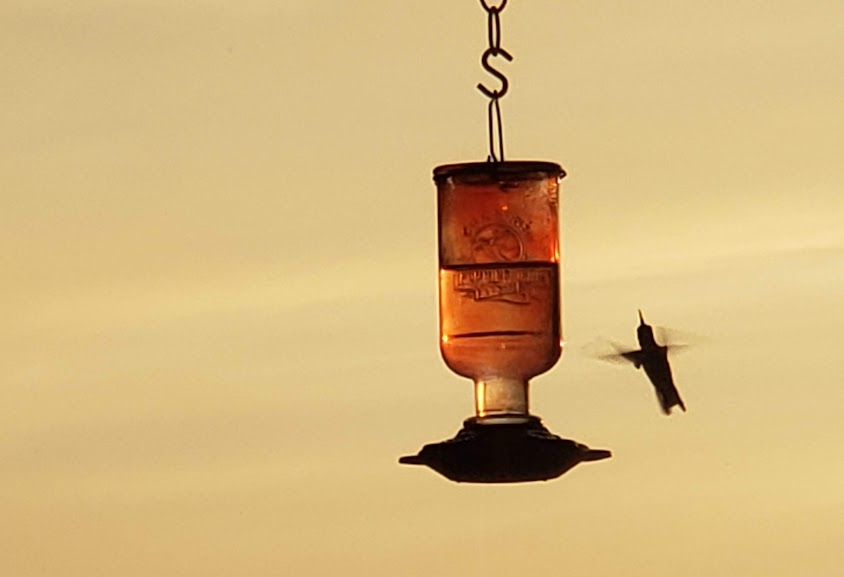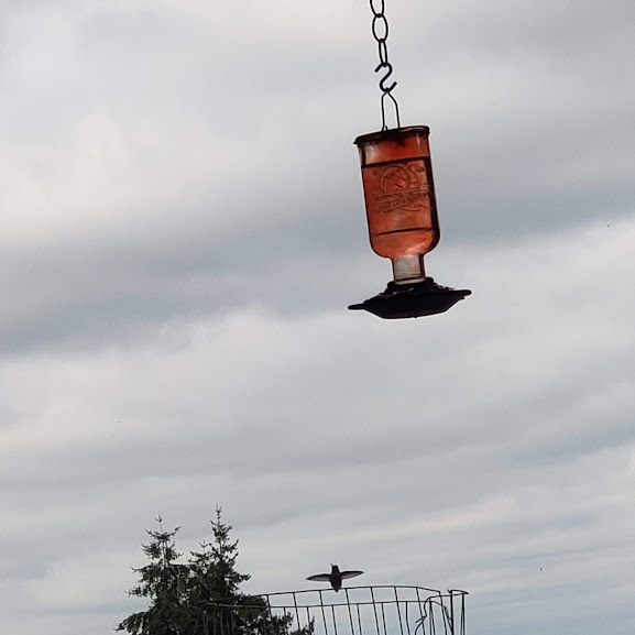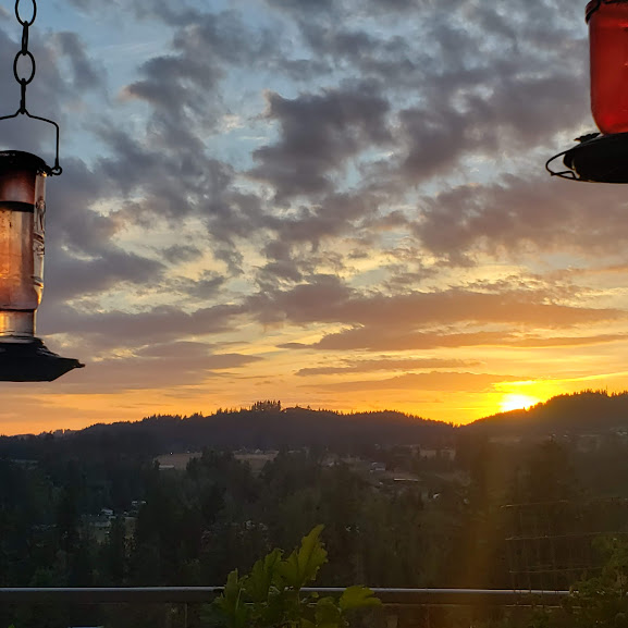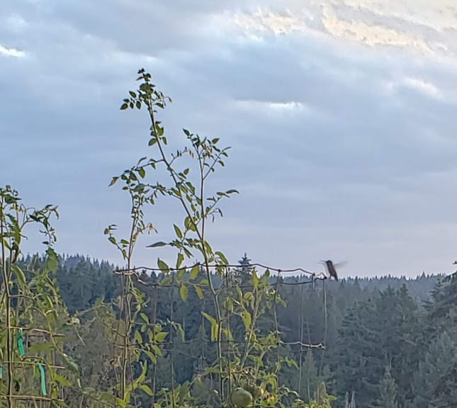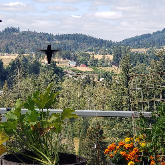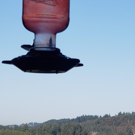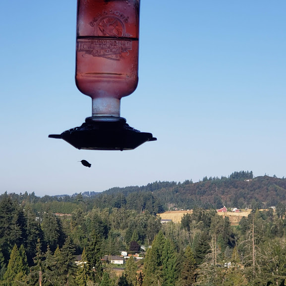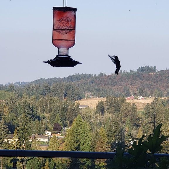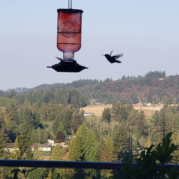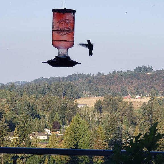Acrobatic daily hummingbird.Very acrobatic!Can you see part of the second one? They were really battling over the feeder today.They move so fast that it’s hard to get photos of them, and I’m always so happy when I do.There was so much smoke in the air from southern Oregon wildfires that we couldn’t even see the mountain today.