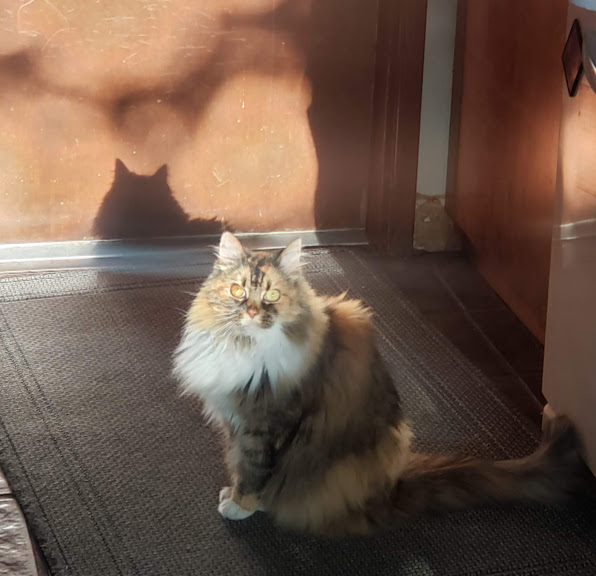 Daily hummingbirds fighting over the feeder.Mines!!This lot across the road was totally cleared of almost every single tree (over 30 big firs). This barn was left standing, but I’m not sure for how long.I finished the first bobbin. “Desert Sage” by Southern Cross Fibre.Kalakoa with her shadow in the afternoon sun…waiting for dinner.