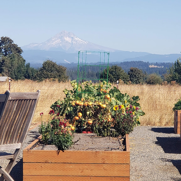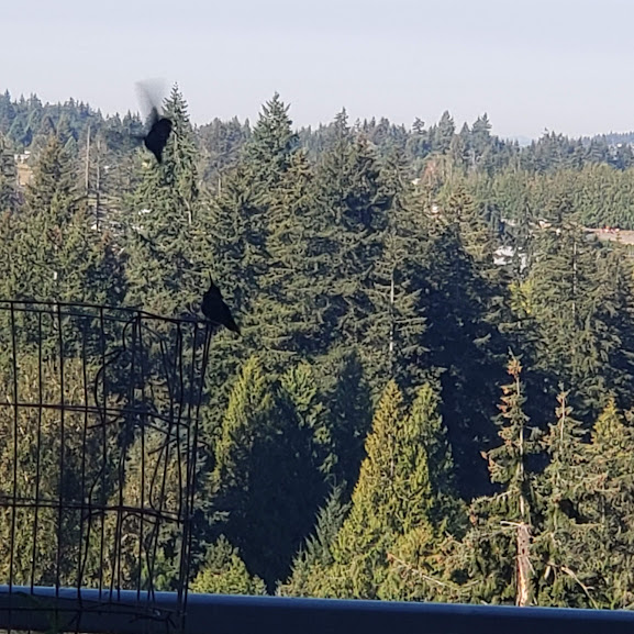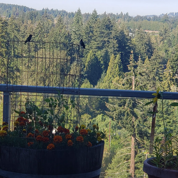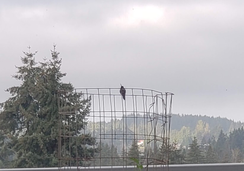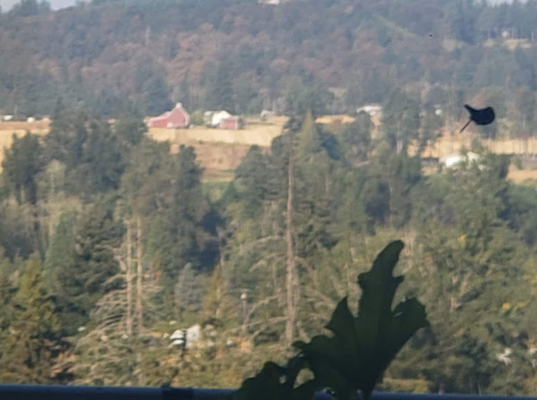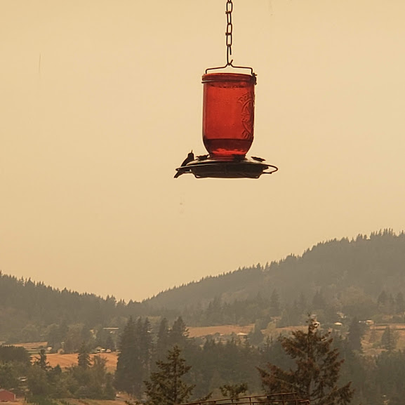 This is what the sky looked like when I got up this morning. Yikes! One of my friends and her family was in the “GO!” zone, and another in the “Get ready!” zone. Both evacuated two years ago so this is especially scary for them. Fortunately, the nearest fire has been contained, but they have no power and the fire is still burning.Daily hummingbird in the smoky air.Dueling daily hummingbirds. They’re still very territorial even though there are two feeders right there!Daily hummingbird and a ripe tomato.Because our spring was so wet and long, these are our first regular tomatoes. Usually we have ripe tomatoes in late July and August.