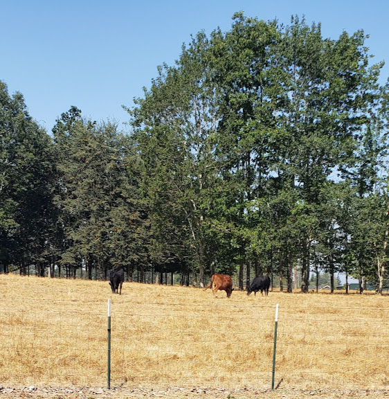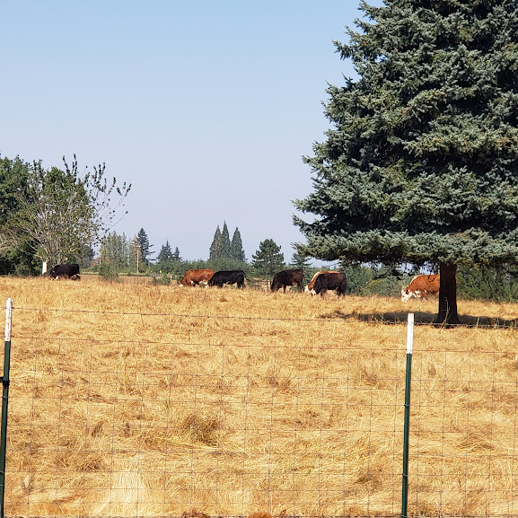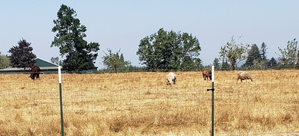 Pīpī and sheep!Above the cattle, you can see how hazy the skies are near the Columbia River. I couldn’t even see Mt Hood today.