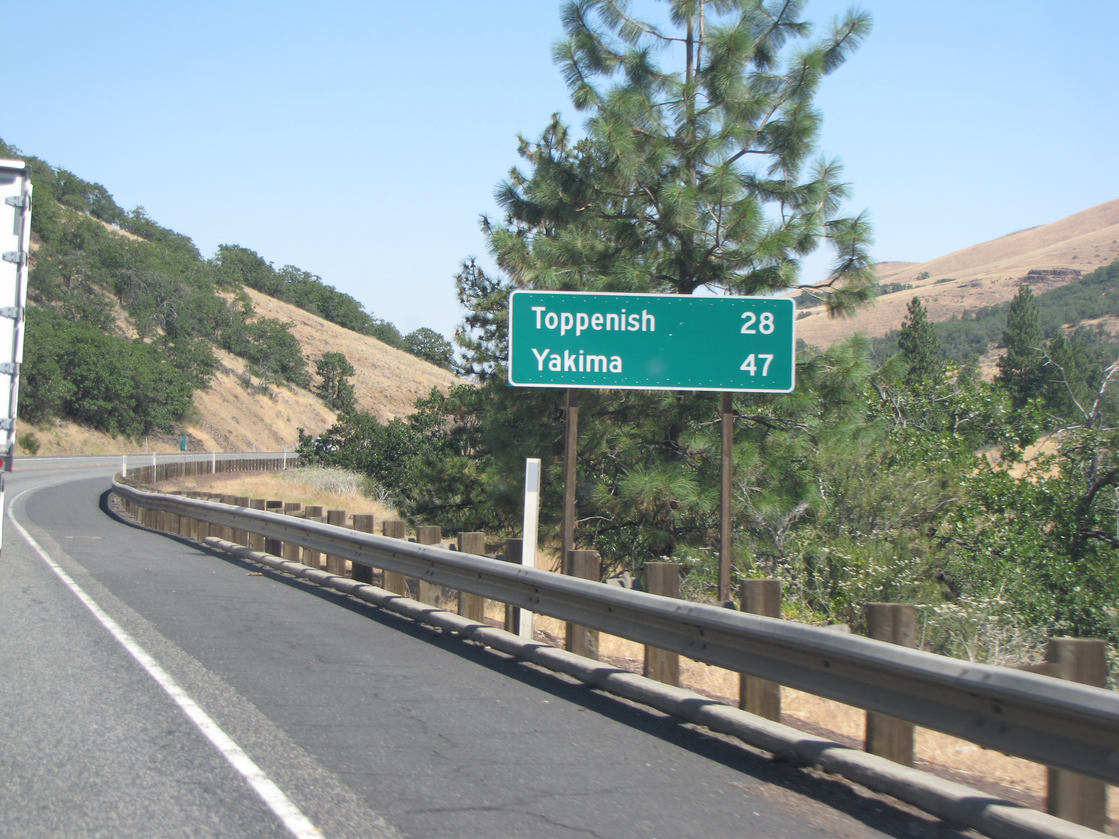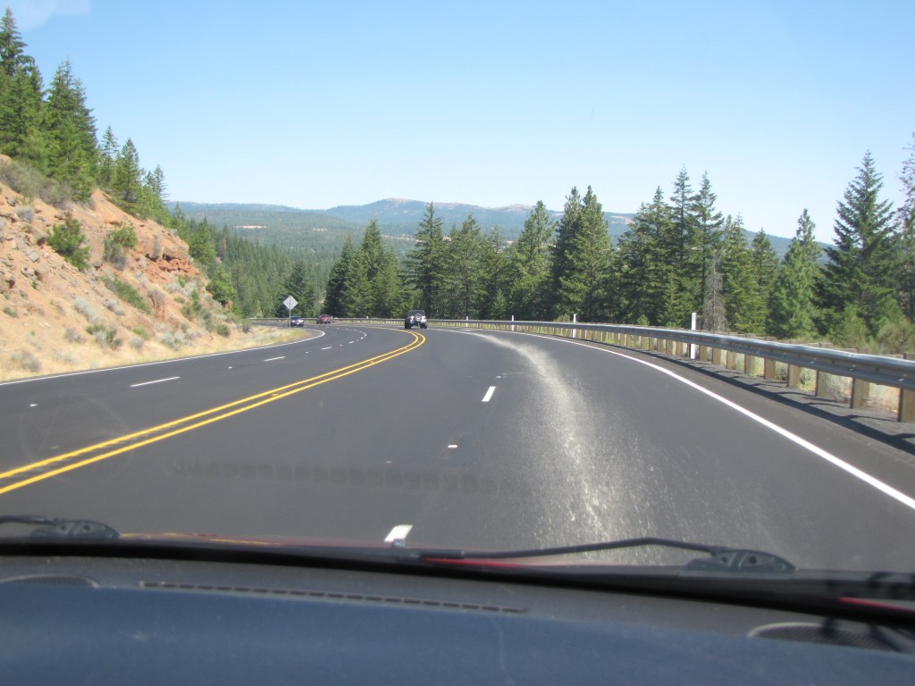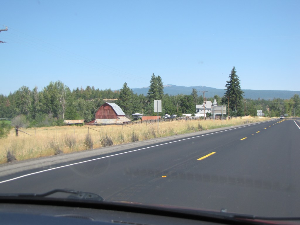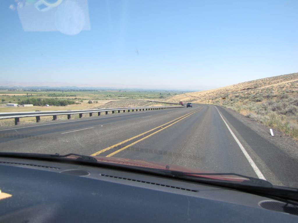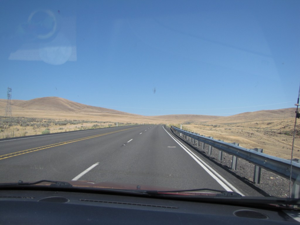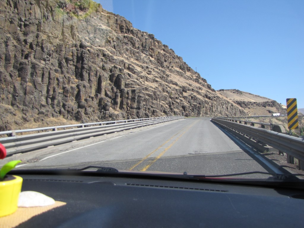 Barns appear awfully quickly, too, when we’re going 55 mph. And try look the Victorian house in the distance.I love looking at houses with turrets. I picture a novelist up there, working on a new book. We’re still climbing. The elevation here was about 2645′. Nolemana is so good about writing down stuffs for me to include in my blog posts.Downhill we go as the passing lane ends. Just about here we entered the Yakima Nation area.Shoots. Our first road construction. Bridge repair. Good thing I allowed extra travel time.We passed through a lovely forested area. There were lots of Douglas Firs and pine trees.Uphill again. It was about 90° now.It was now noon; it sure was dry and barren here.We came around a corner and could see the valley down below us for the first time. I think this was about at mile marker 50.It was good seeing all the green after miles and miles of barrenness. We began seeing a lot of field corn. Musubi was down in the shade so that he wouldn’t get too hot and faded.Yeah, lots and lots of field corn!We’re gonna be heading north again. Wapato: our next planned break. I’d done my research and knew exactly where to go. It was a great stop, which will be in the next post.