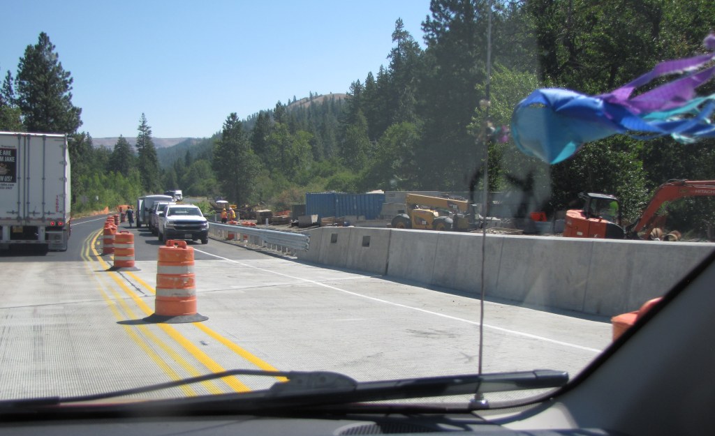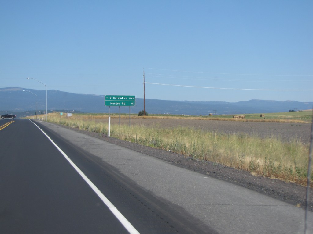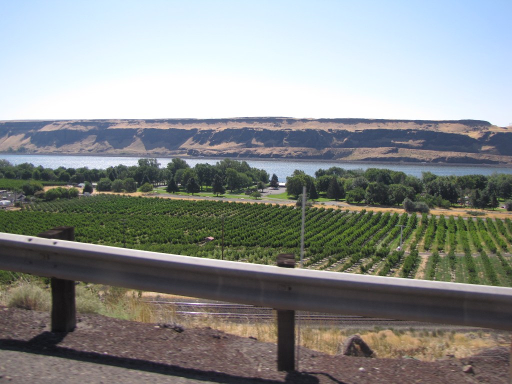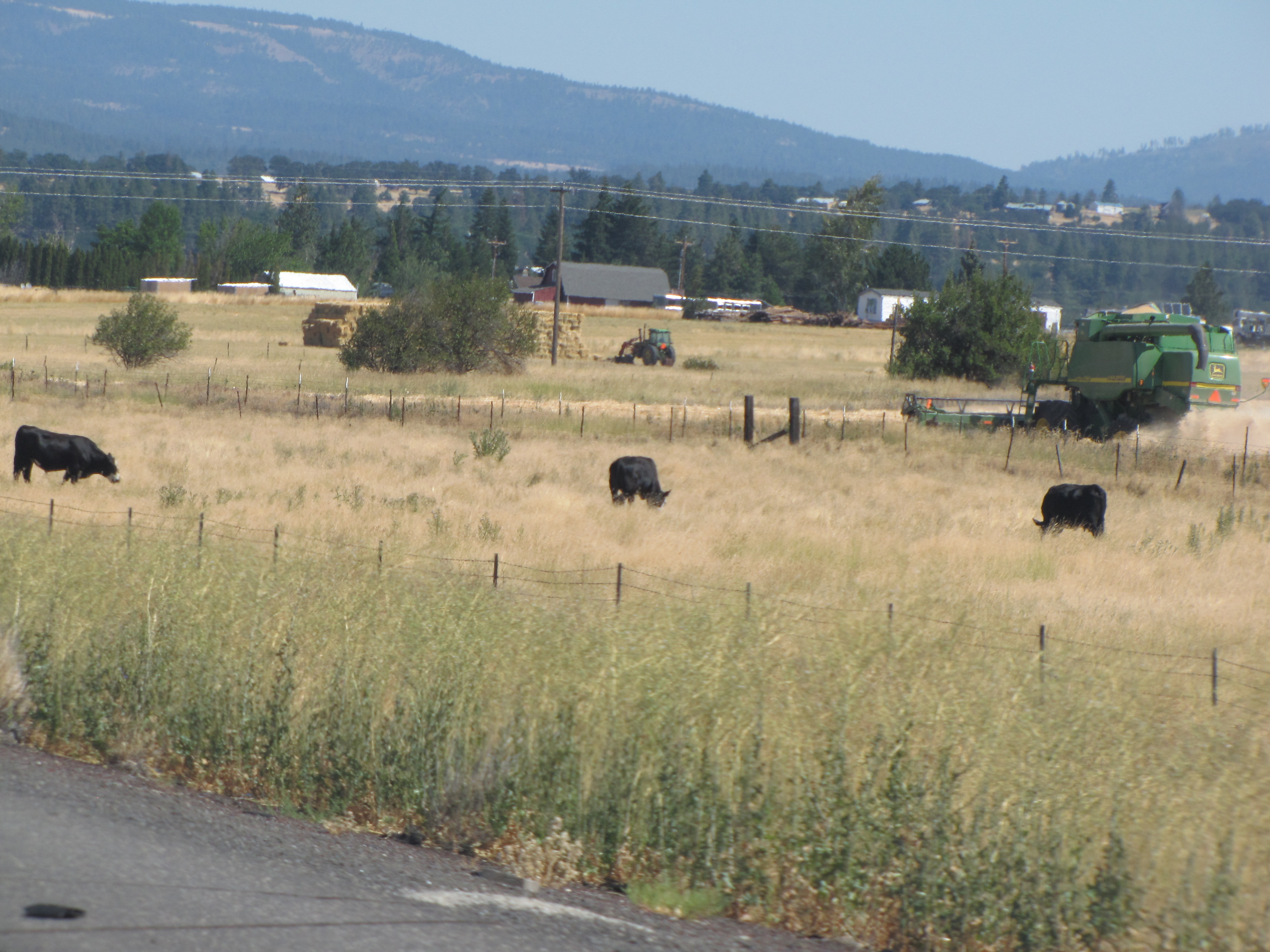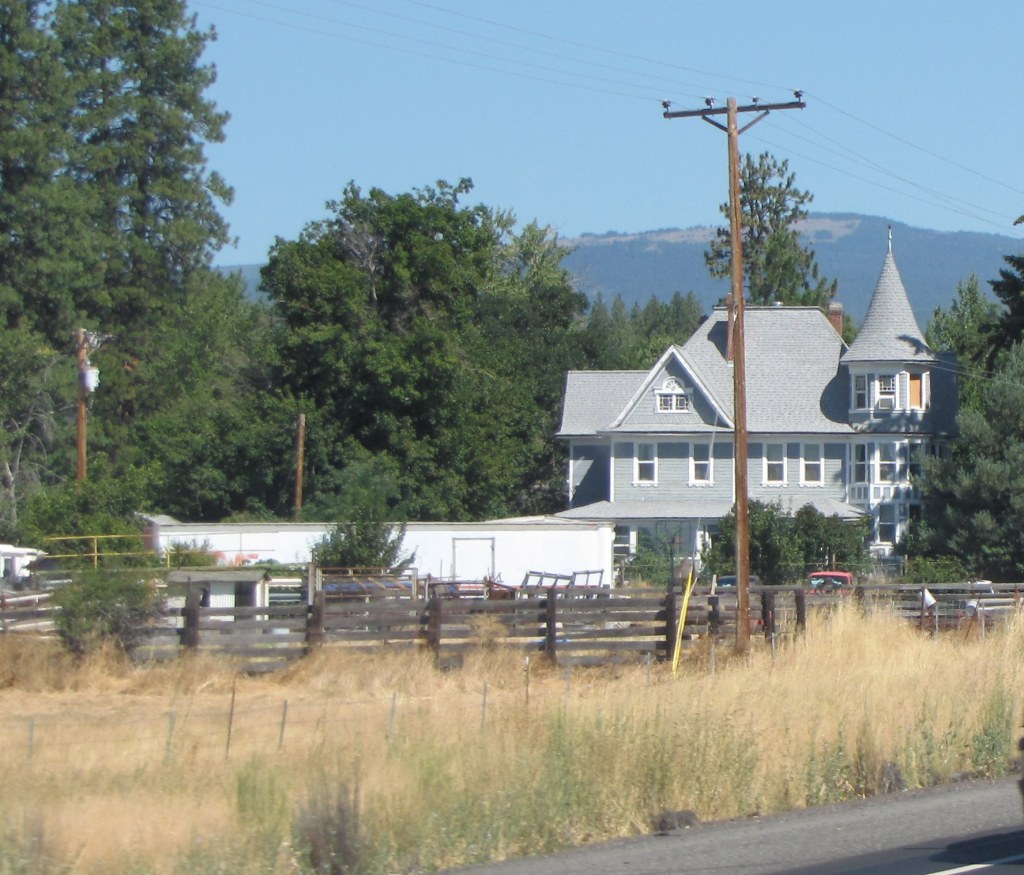 Barns appear awfully quickly, too, when we’re going 55 mph. And try look the Victorian house in the distance.I love looking at houses with turrets. I picture a novelist up there, working on a new book. We’re still climbing. The elevation here was about 2645′. Nolemana is so good about writing down stuffs for me to include in my blog posts.Downhill we go as the passing lane ends. Just about here we entered the Yakima Nation area.Shoots. Our first road construction. Bridge repair. Good thing I allowed extra travel time.We passed through a lovely forested area. There were lots of Douglas Firs and pine trees.Uphill again. It was about 90° now.It was now noon; it sure was dry and barren here.We came around a corner and could see the valley down below us for the first time. I think this was about at mile marker 50.It was good seeing all the green after miles and miles of barrenness. We began seeing a lot of field corn. Musubi was down in the shade so that he wouldn’t get too hot and faded.Yeah, lots and lots of field corn!We’re gonna be heading north again. Wapato: our next planned break. I’d done my research and knew exactly where to go. It was a great stop, which will be in the next post.