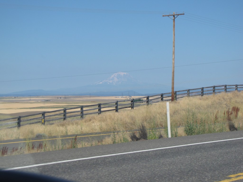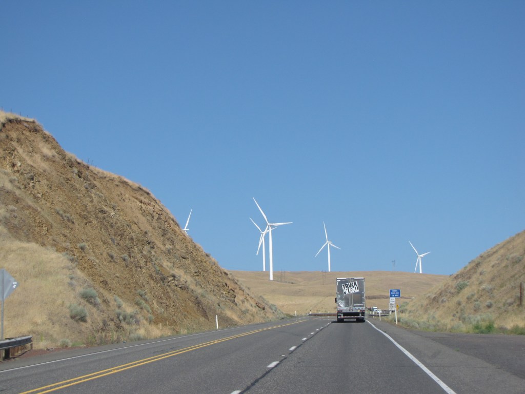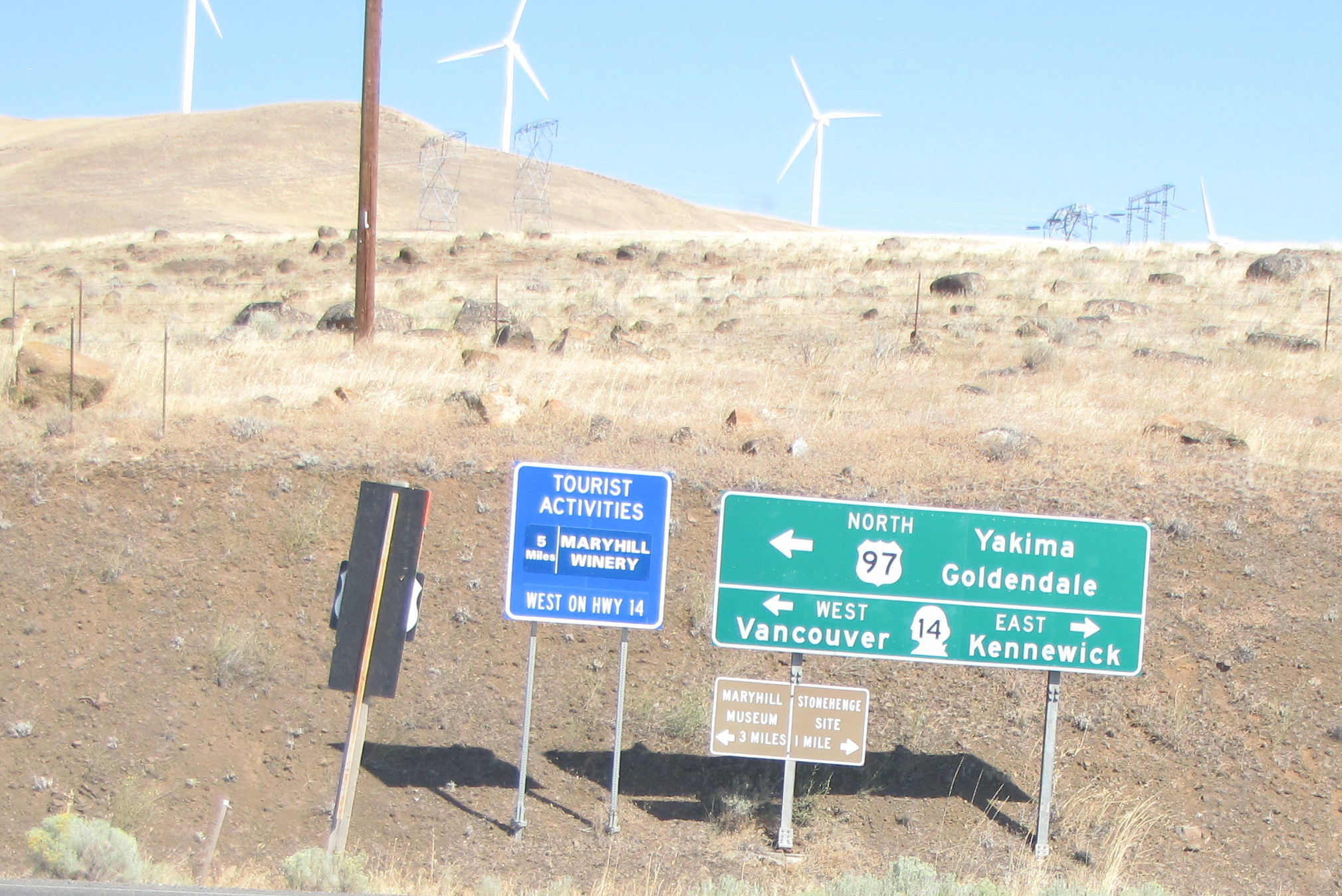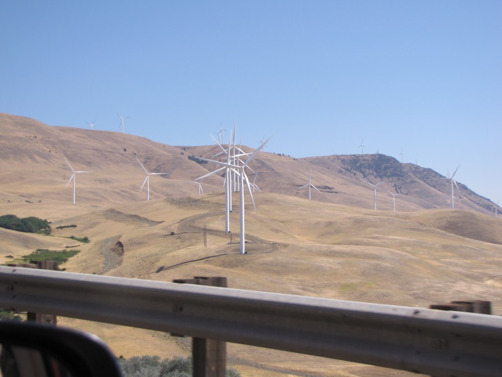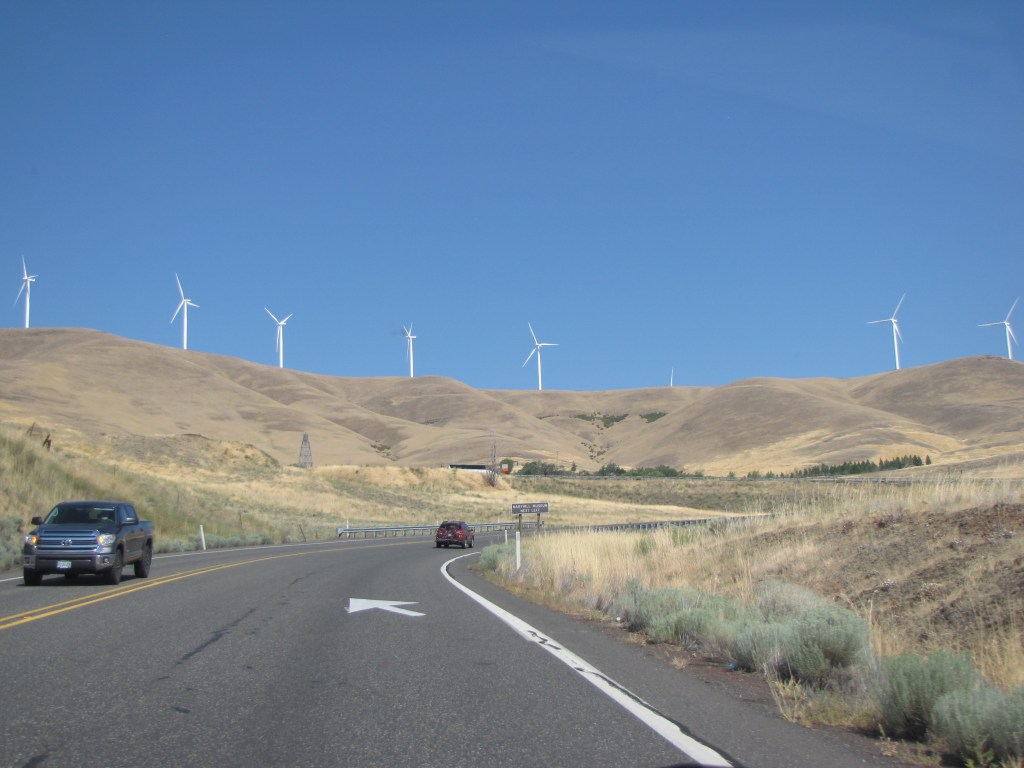 Here we’re heading up the hill towards Goldendale. We’d been on this highway several years ago, only going in the opposite direction. So it was like new territory for us.There are a lot more vineyards than there used to be in the area.Still going up the hill; it sure was hot and dry.There were a lot of wind turbines, which isn’t surprising considering how much win there is in the Columbia Gorge.Lots of choices here! Even though North is West, soon it’ll be north again. Huh?Yep. Lots and lots of wind turbines. You don’t realize how huge they are till you get up closer to them.Mt Adams through the haze.We have friends in Goldendale, but didn’t have time to stop for a visit.Whoo hoo!!! Pīpī for AFK!!