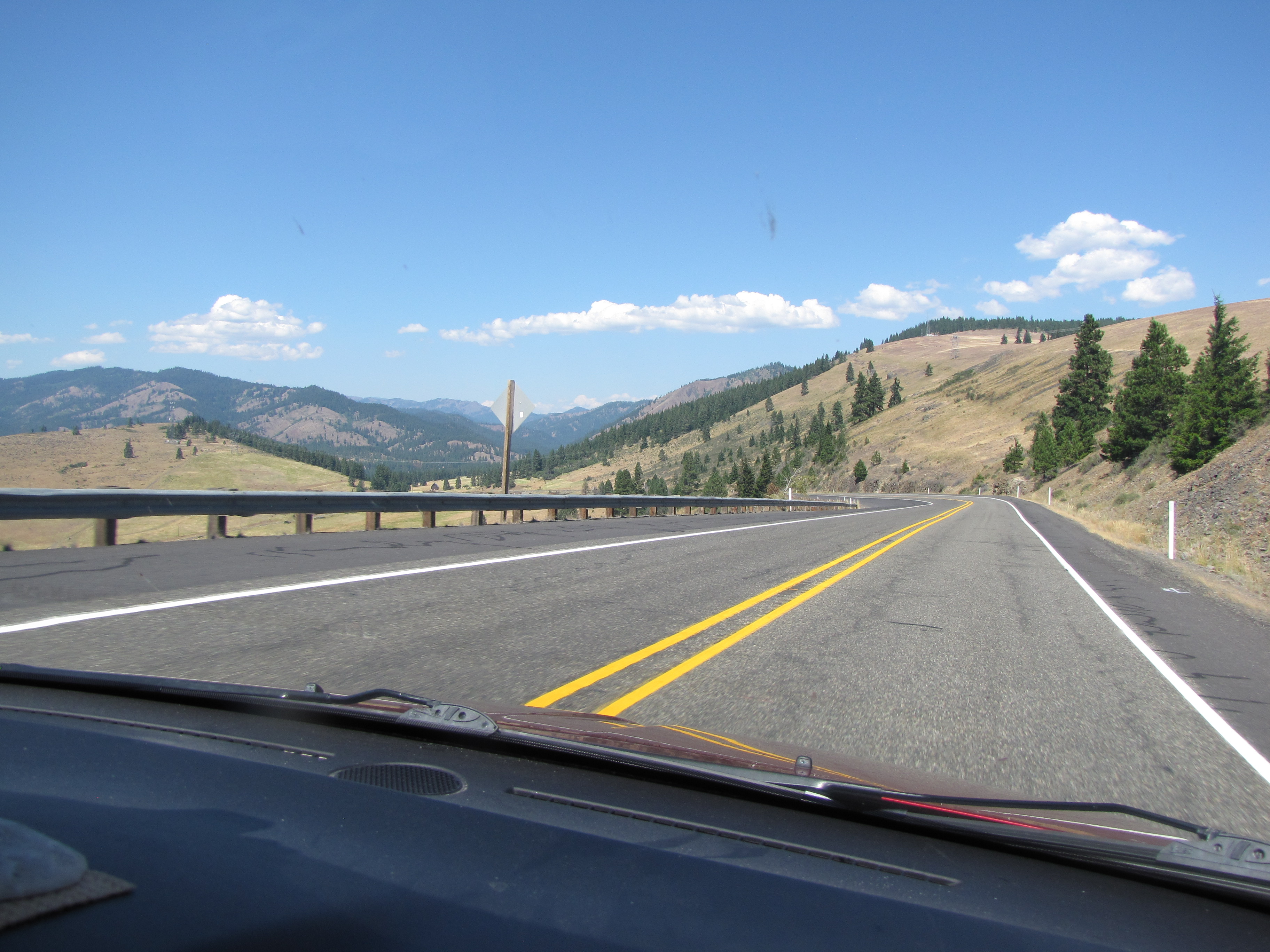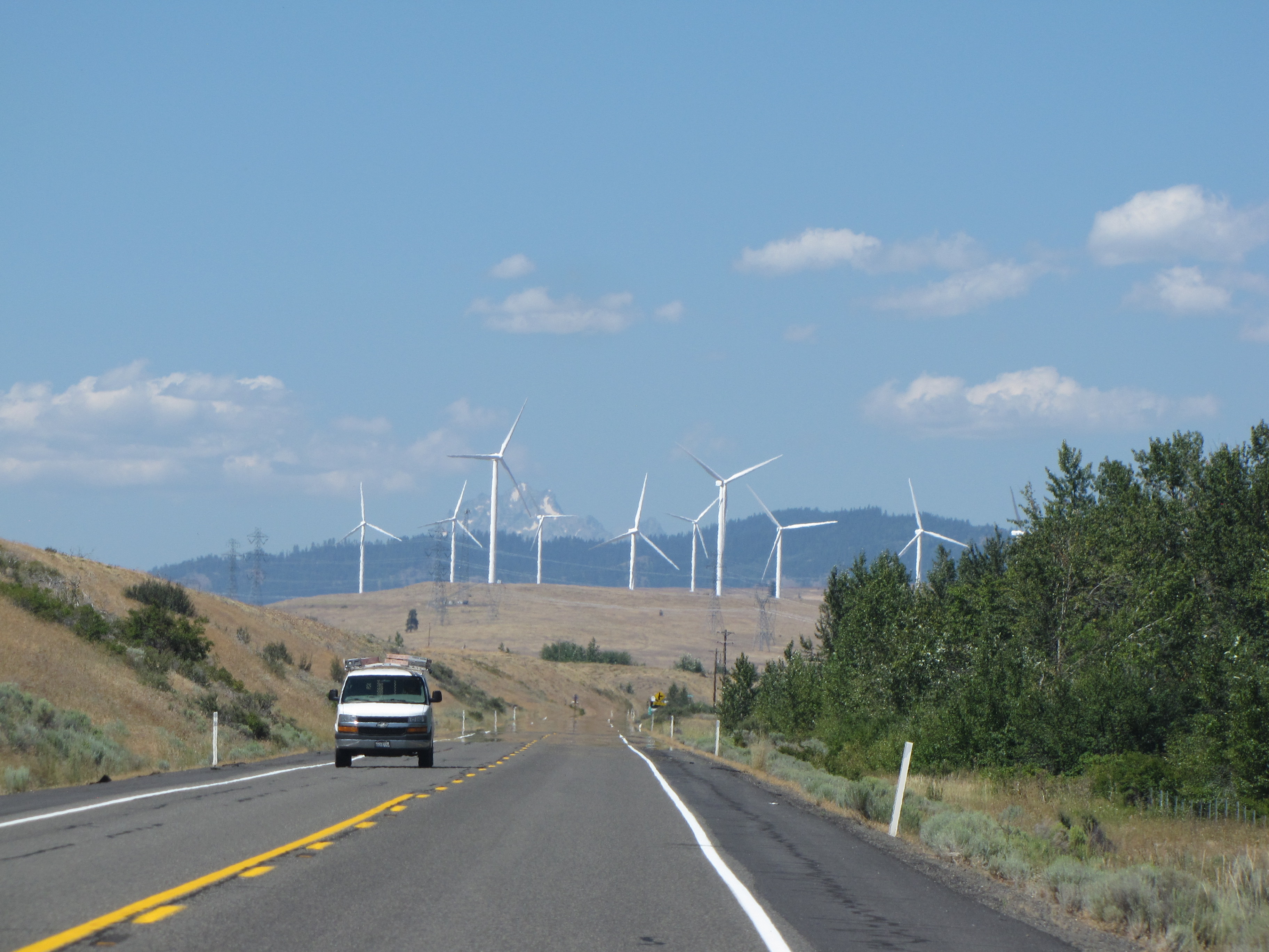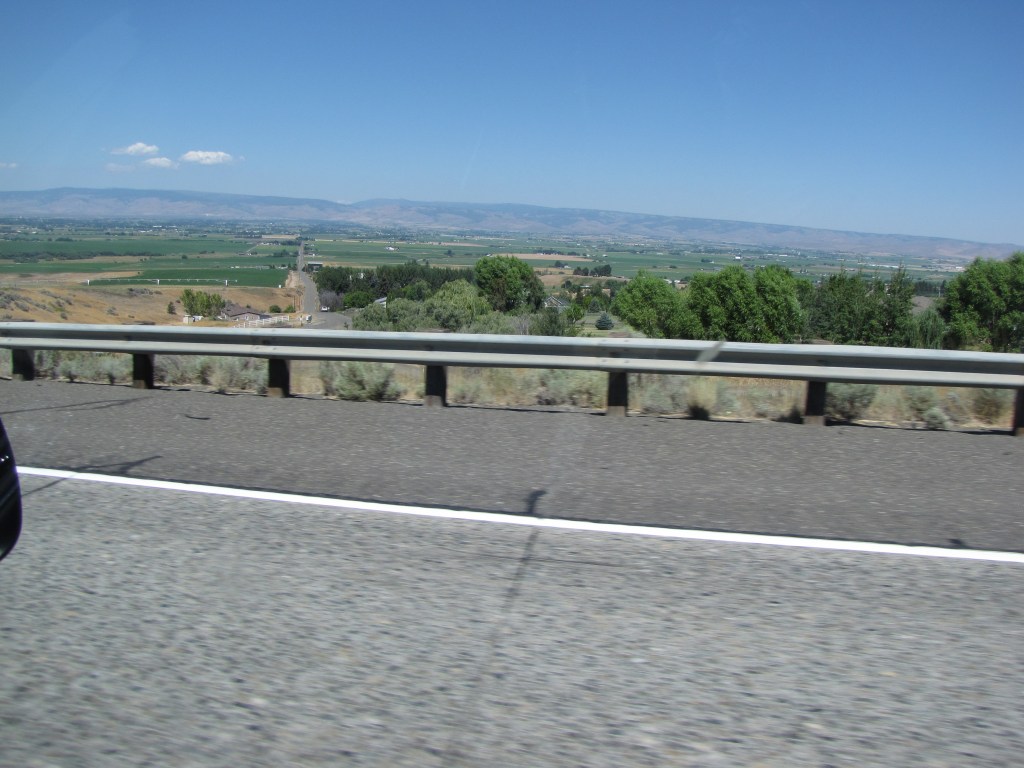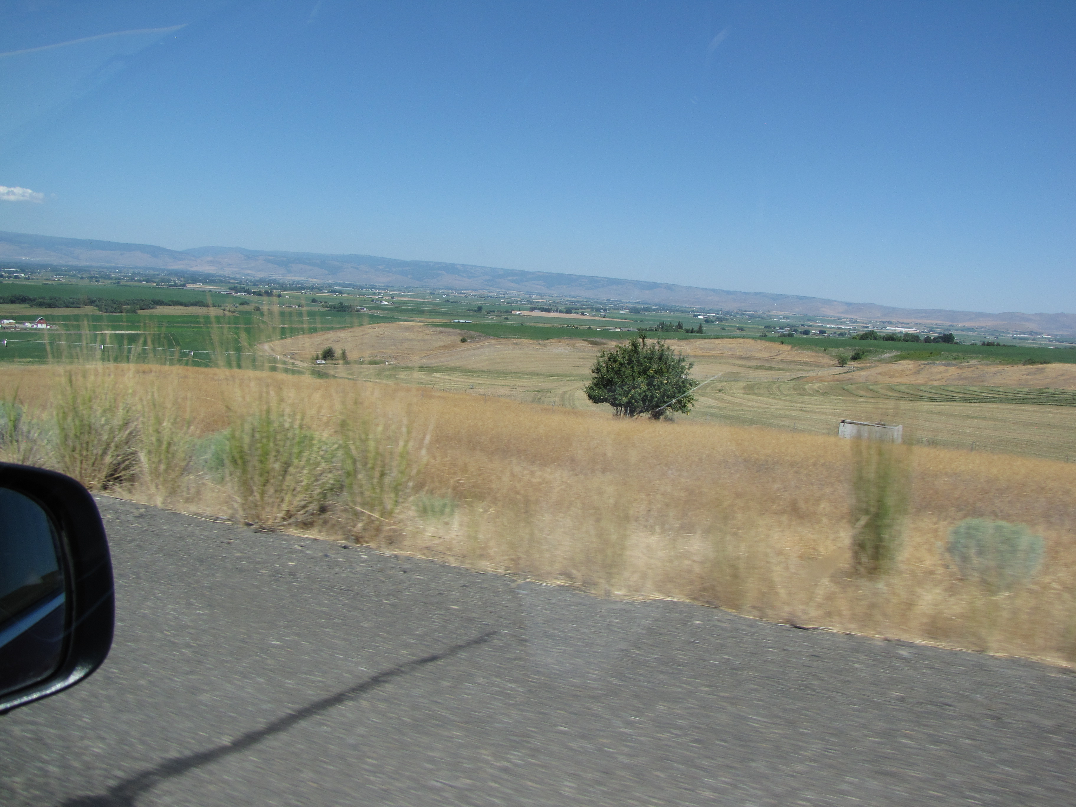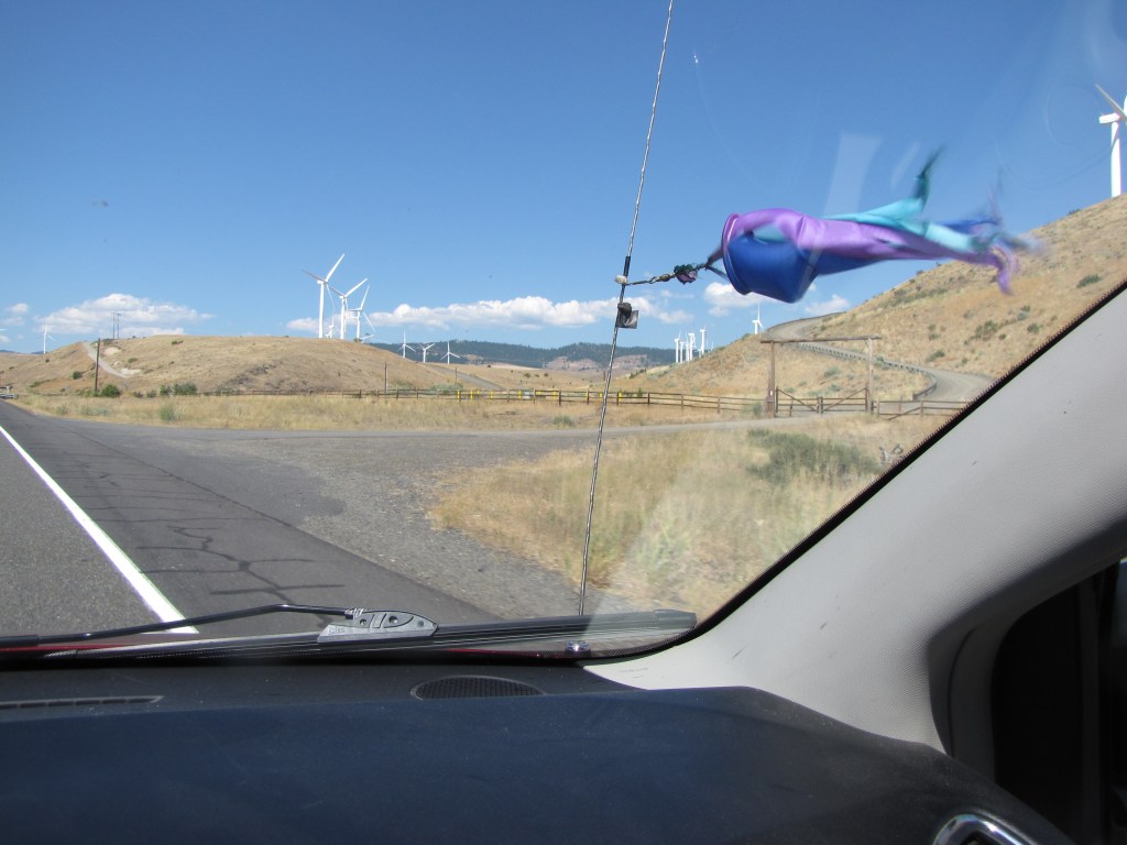 Manastash Ridge Elevation 2672Ellensburg appears down below and ahead of us and we start heading downhill.I’ve seen some Google photos where everything to the right is covered with fog; I’m glad it was clear today.It was wonderful seeing all the green after all the barren views we’d been driving through.I think this was Mattoon Lake just outside Ellensburg.Silver alert. We saw several of these signs around Ellensburg both coming and going. Stolen cars warning.We were trying to find a coffee shop where we could change into our wedding clothes, but saw this first so decided to stop here. I was really getting antsy about the time. The bathrooms were clean, and we were in and out of there in less than ten minutes.Another friend who knows the area told me how windy it gets here; that Ellensburg is a really nice town, but the wind is fierce. I could believe it, seeing all these wind turbines!There were more after every corner we turned.Our own little spinner was still hanging on bravely.It was looking a little less barren here, just outside Ellensburg. We were climbing into the mountains, too. We’re still on Highway 97; the elevation here was 2646′, I think, and it was 2:20 pm. We were aiming to get to the wedding venue by 3:30; the wedding was to start at 4:30 but we wanted to get there plenty early to have time to visit with ʻohama.Barn!! Nolemana managed to take the photo even though we were going 55 mph.Wenatchee right turn – 1/2 mileCle Elum/Seattle West, Wenatchee East. We’re heading north. And then onto the next chapter!