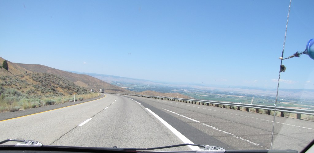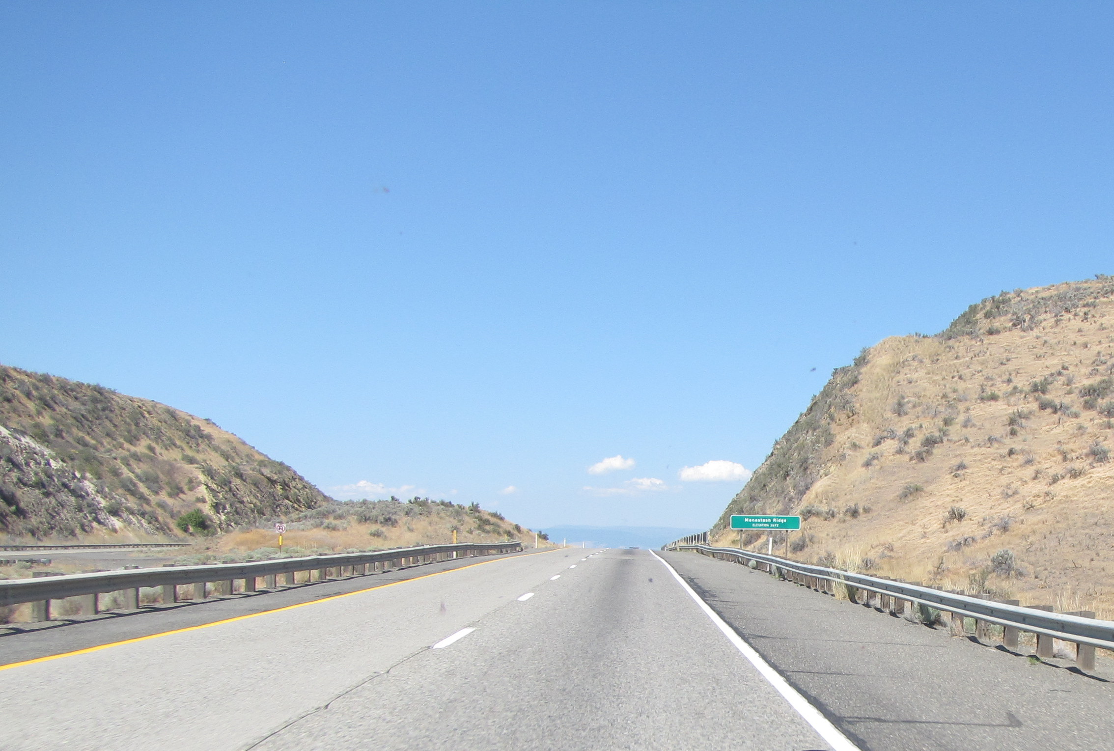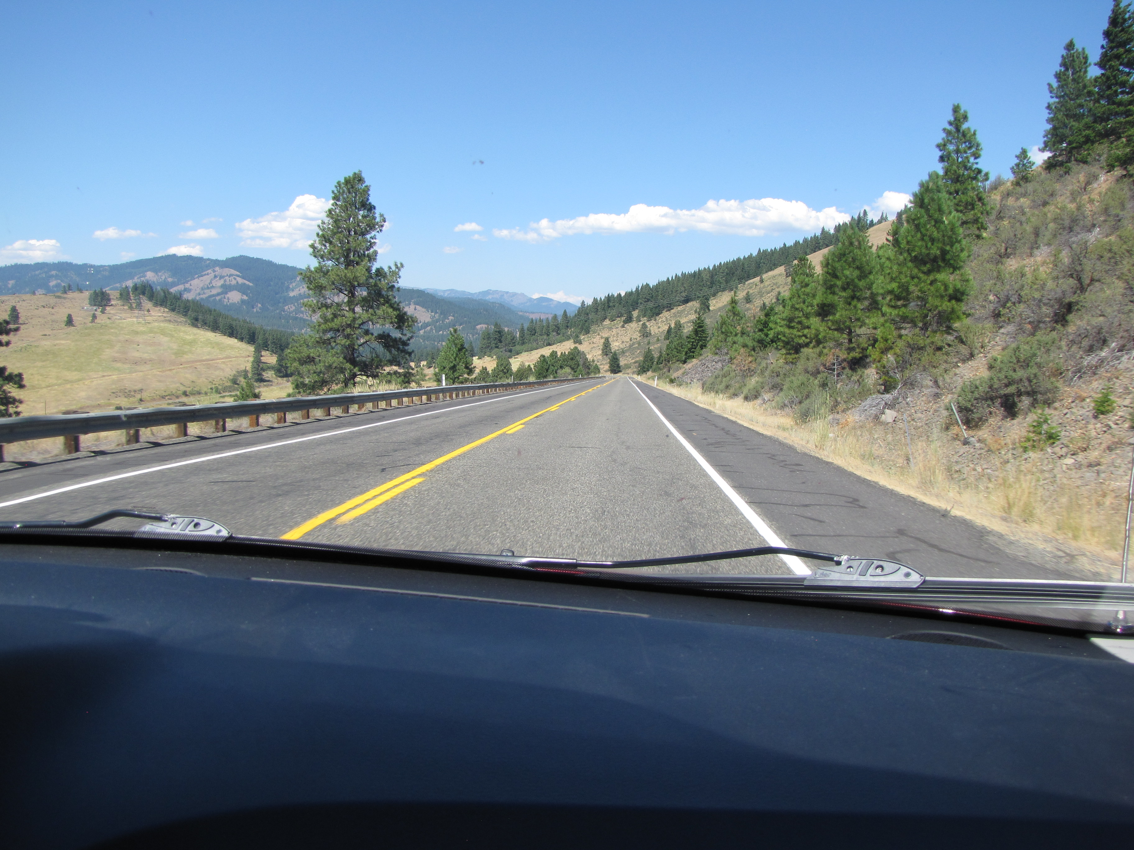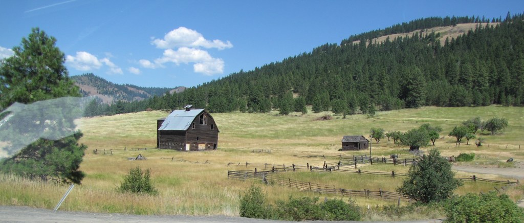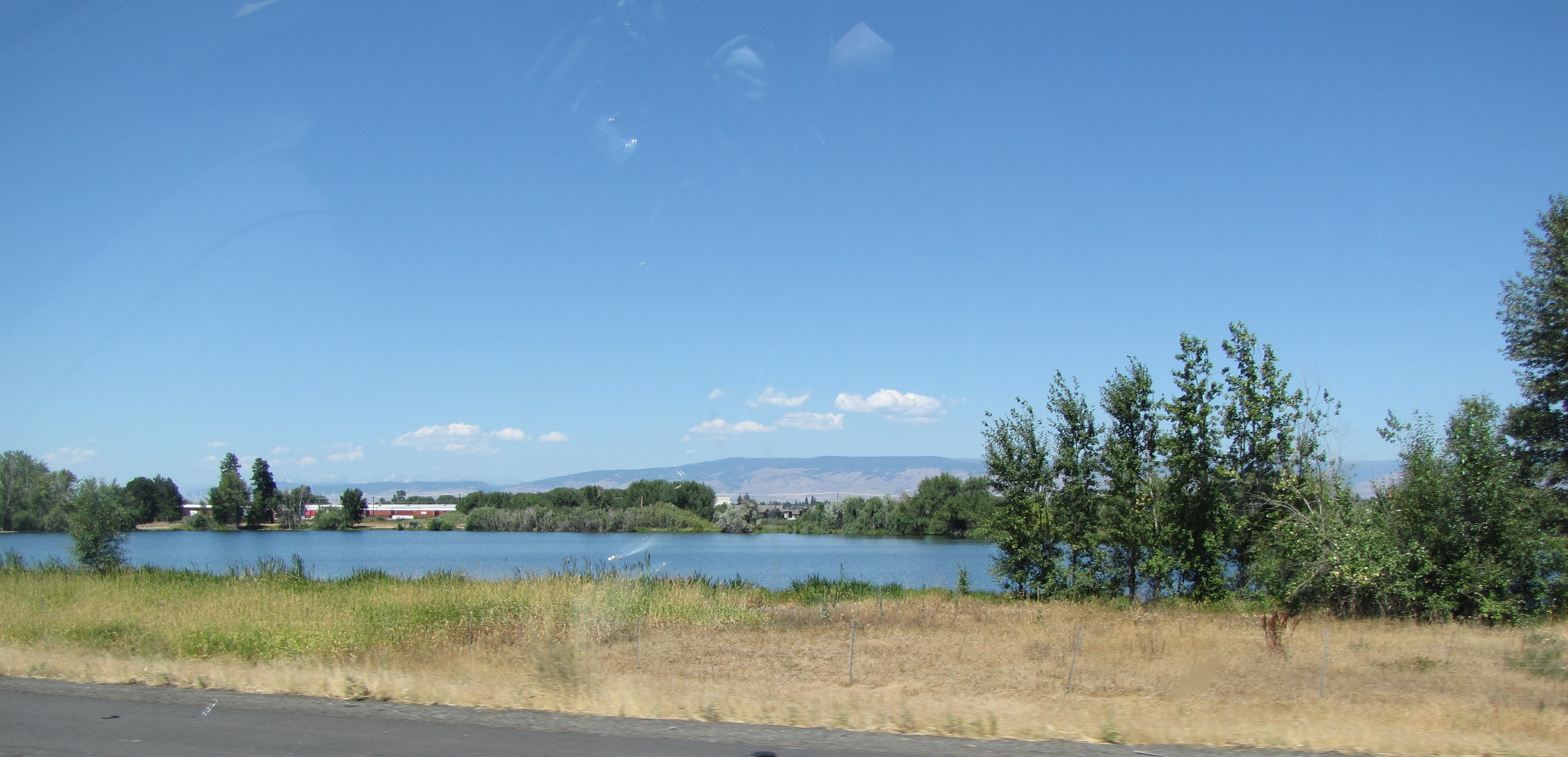 Manastash Ridge Elevation 2672Ellensburg appears down below and ahead of us and we start heading downhill.I’ve seen some Google photos where everything to the right is covered with fog; I’m glad it was clear today.It was wonderful seeing all the green after all the barren views we’d been driving through.I think this was Mattoon Lake just outside Ellensburg.Silver alert. We saw several of these signs around Ellensburg both coming and going. Stolen cars warning.We were trying to find a coffee shop where we could change into our wedding clothes, but saw this first so decided to stop here. I was really getting antsy about the time. The bathrooms were clean, and we were in and out of there in less than ten minutes.Another friend who knows the area told me how windy it gets here; that Ellensburg is a really nice town, but the wind is fierce. I could believe it, seeing all these wind turbines!There were more after every corner we turned.Our own little spinner was still hanging on bravely.It was looking a little less barren here, just outside Ellensburg. We were climbing into the mountains, too. We’re still on Highway 97; the elevation here was 2646′, I think, and it was 2:20 pm. We were aiming to get to the wedding venue by 3:30; the wedding was to start at 4:30 but we wanted to get there plenty early to have time to visit with ʻohama.Barn!! Nolemana managed to take the photo even though we were going 55 mph.Wenatchee right turn – 1/2 mileCle Elum/Seattle West, Wenatchee East. We’re heading north. And then onto the next chapter!