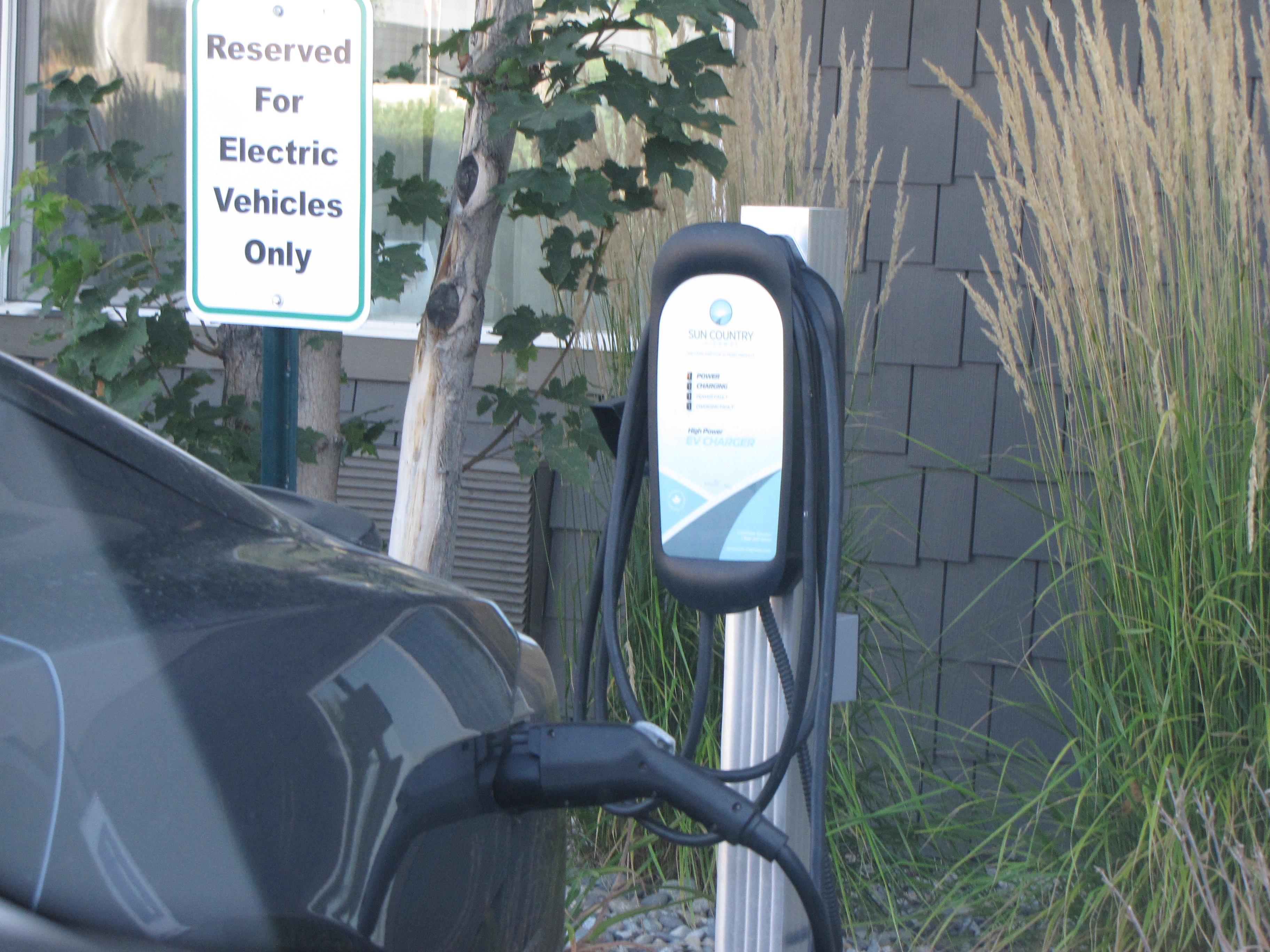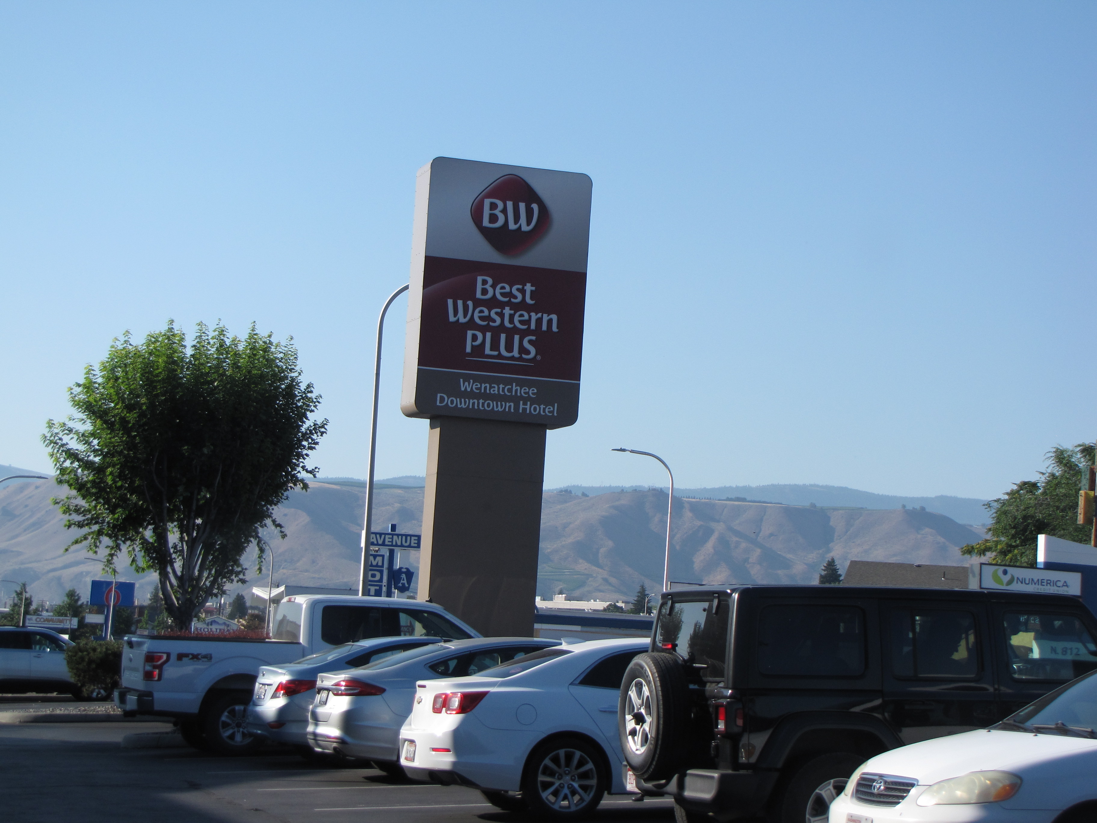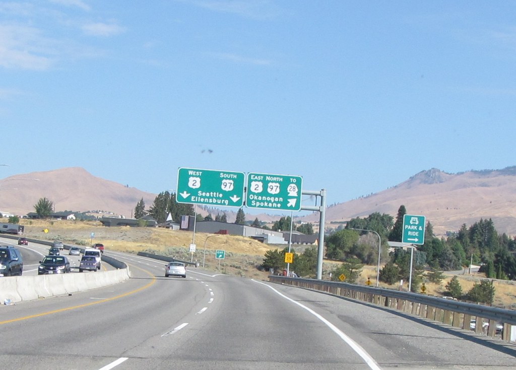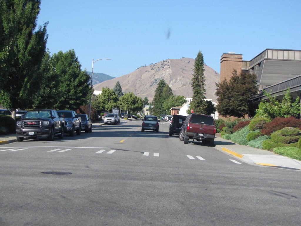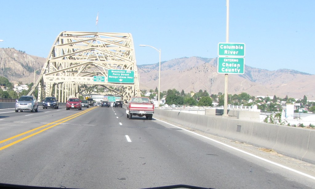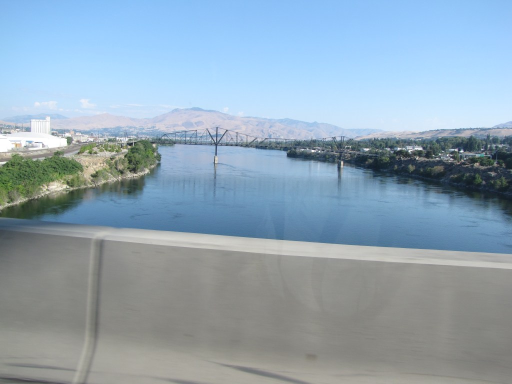I’d seen car chargers elsewhere, but had never actually seen a car getting charged up before. There were several car charging stations in the motel’s parking lot.Our route from our motel was back up Highway 2. We said goodbye to the motel. I’d checked online to see if there were any yarn shops in Wenatchee, of course.Well, there was!! But unfortunately, it wasn’t open yet. It was only 8:30 a.m., and we couldn’t wait till 10:00. It looked like a wonderful shop from the outside, though. Yarn Bird Knit Shop. I want to go see it for realz sometime. I looked it up online; and Yarn Bird definitely appeals to me, of course.We needed to get gas, so checked to see where the nearest Union 76 station was, because that’s what kind of gas credit card we have. So following Google maps, off we went.This was a really nice park. It was good to see all the green compared to the surrounding hills.On our way to the gas station, or so we thought. Try look the gas prices. Not too bad, considering what they had been.Uh-oh. We saw the gas station on the other side of the street, but there was no way to turn into it, so we had to go onto the bridge across the Columbia River. Ack!! Now where?Let’s go over the bridge, shall we? Now I had no idea where to turn around.I finally found a road where we could turn around, so back across the Columbia River we went.Heading in the right direction now, we knew where the gas station was and headed for it.View from the bridge of the Columbia River. We’re so used to seeing it down our way and it was a different experience seeing it so much further north.