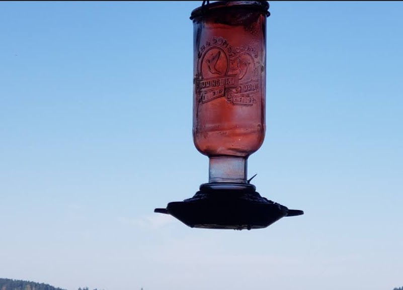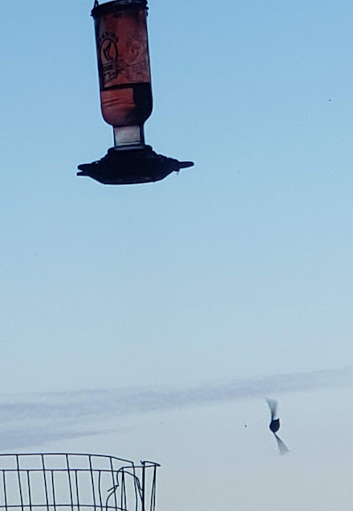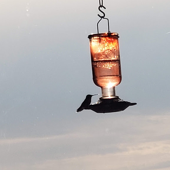 Daily hummingbird. See the drop of syrup on his beak?