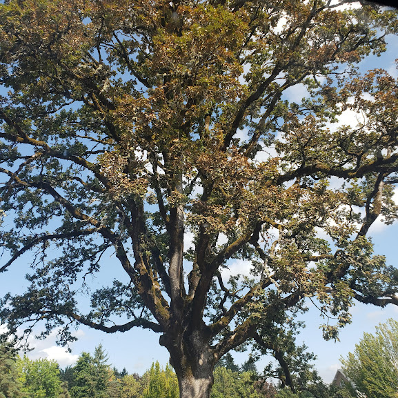 Sunlit oak tree, my waiting tree, while Nolemana is at the retinologist’s.